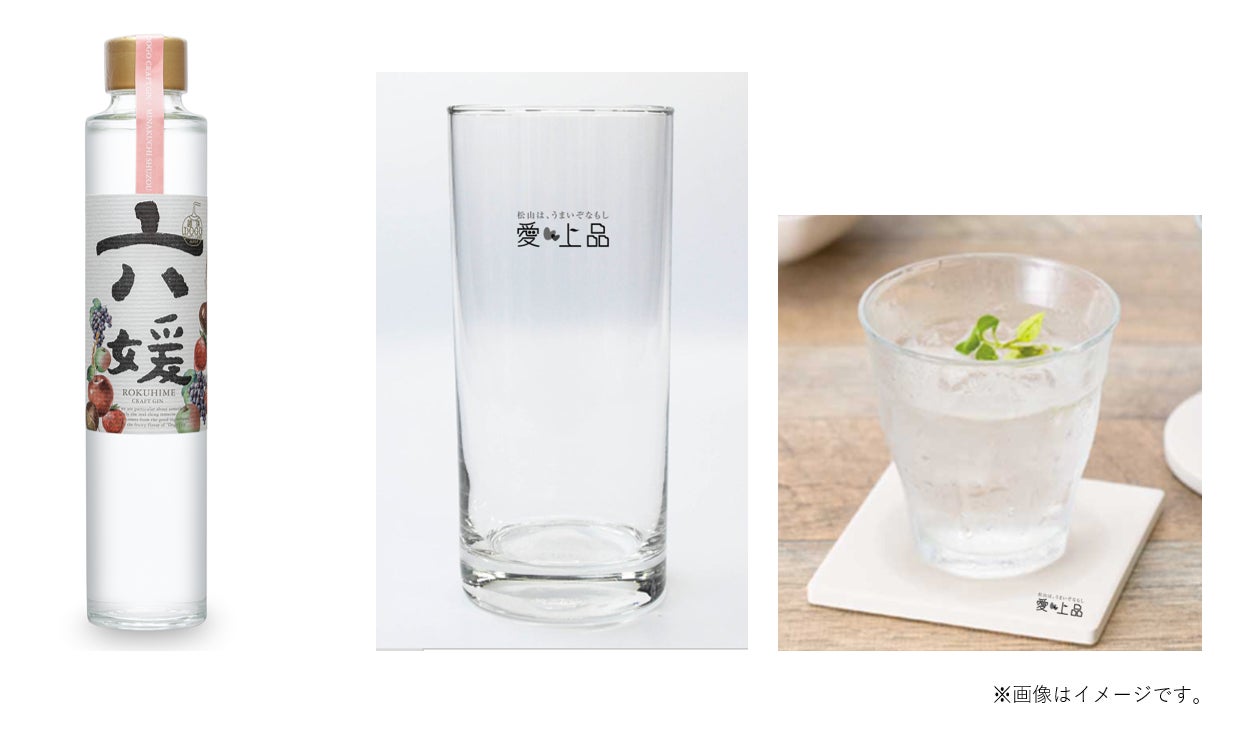 道後ジン「六媛」は、愛媛県内の松山市、伊予市、東温市、久万高原町、松前町、砥部町の3市3町の特産品をブレンドした一品。口に含んだ直後は、栗・はだか麦の香ばしさ、続いて松山市の伊台・五明こうげんぶどうやイチゴの甘みと酸味、終盤はリンゴや梅のさっぱり感が魅力の華やかなジンで構成されており、6つの素材の香りが移りゆく変化を堪能できます。また、本コースのノベルティーには「愛 上品」グラスと「愛 上品」珪藻土コースターをご用意。コースターは珪藻土でできているため、グラスの水滴を吸収。透明度の高いグラスは、「六媛」の透明感を邪魔しない仕様。ぜひこちらのグラスに「六媛」を注ぎ、お好きな割り方でお楽しみください。