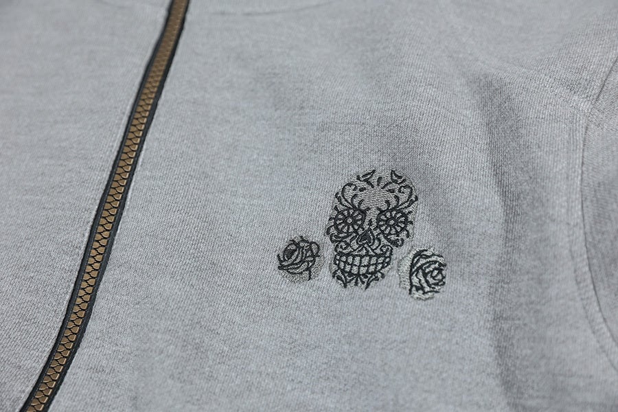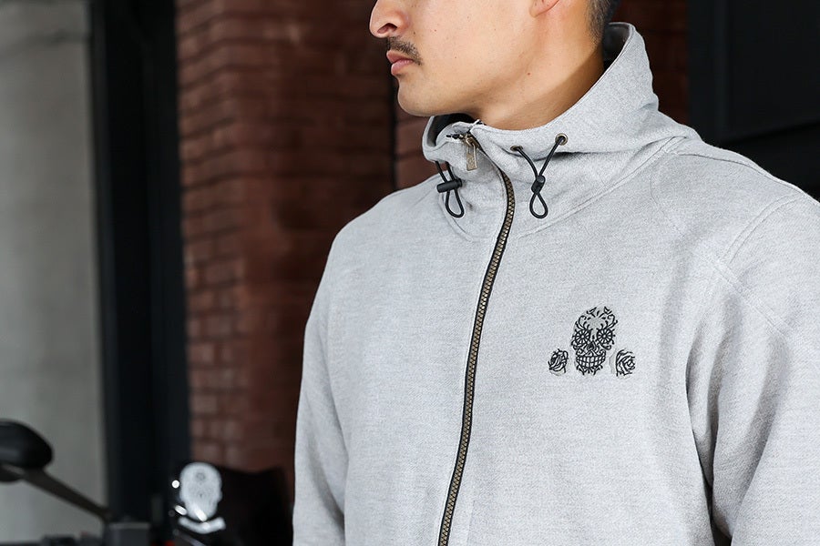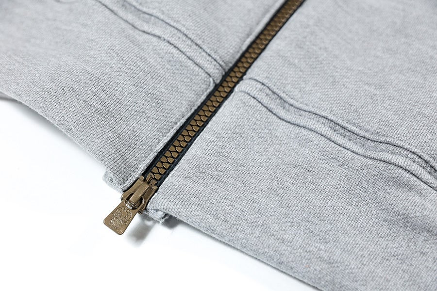 ジッパーには特注のYKK製撥水ジッパーを使用しました。引手部分にはブランドロゴのスカルをデザイン。ありがちなジッパー部分からの服の中への浸水も軽減できます。