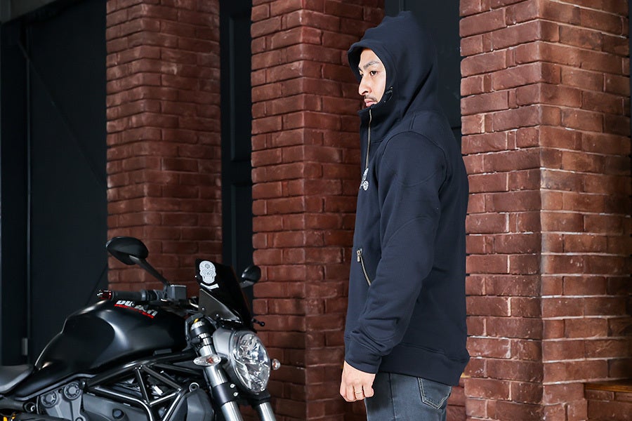 今回は上下セットでの企画です。パーカーだけでなく、パンツにもプロテクターが着用可能。バイクに乗り降りしやすいよう、蛇腹加工も施しました。