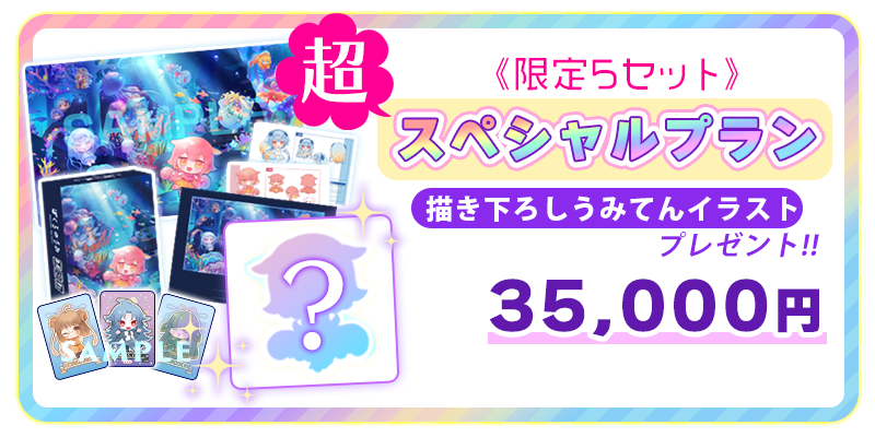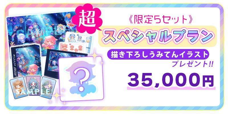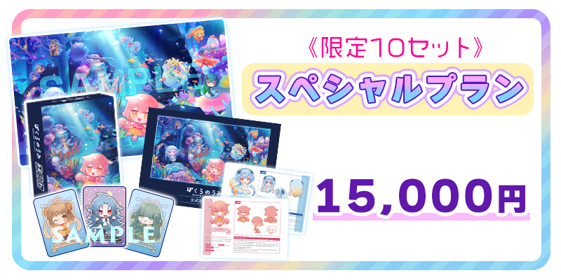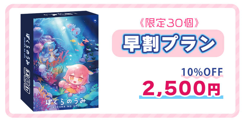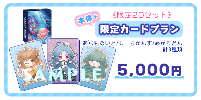 5セット限定!『ぼくらのうみ』本体1個+プレイマット1枚+限定カード(あんもないと/しーらかんす/めがろどん)+ぼくらのうみ設定資料集1冊+書き下ろしうみてんイラストがセットになったプランです。