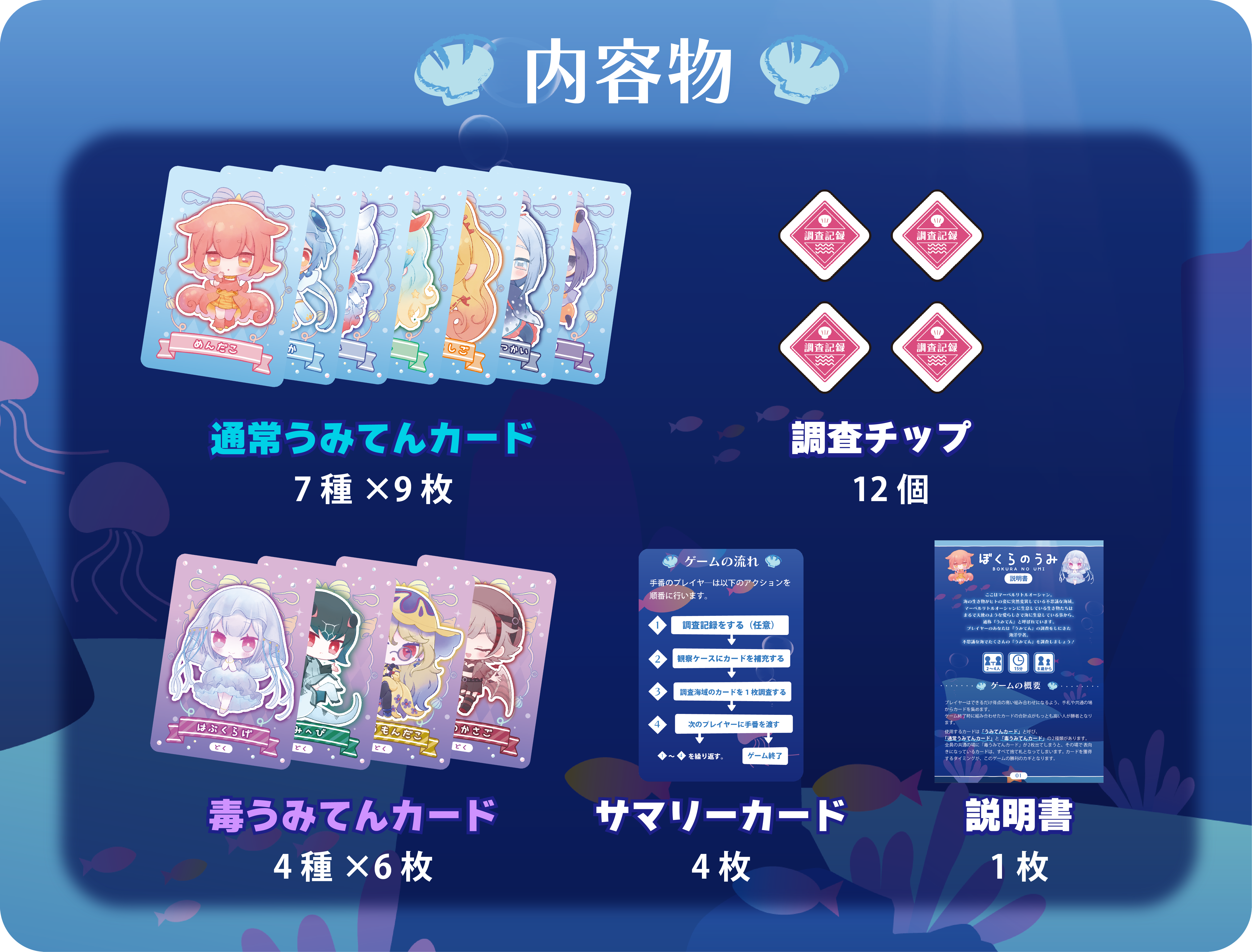 使用するカードは「うみてんカード」と呼び、「通常うみてんカード」と「毒うみてんカード」の2種類があります。