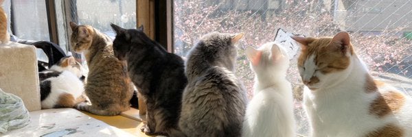 『ラブとハッピー』は京王線南平駅のすぐそばにあり、春には猫さんたちがウインドーからお花見をしながら、ゆったりと過ごしています。