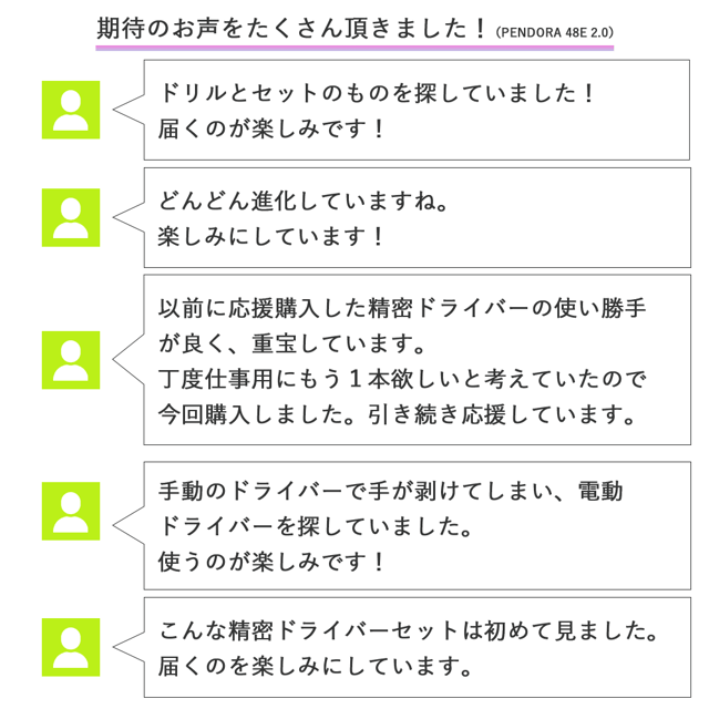 2023/01/01 00:14サポーターの皆様、Brightサポートチームです。お世話になっております。プロジェクト開始から49日目で58人もの支援者の方々よりご支援を頂き、無事プロジェクト終了を迎えることが出来ました。早速皆様のリターンを2023年02月にお届けできるよう準備を始めております!皆様にご満足いただけるリターンをお届けできるよう、全力で取り組んで参りますので引き続き、「更に便利に、コンパクトスタイルに!電動ドライバーセットPENDORA 28E」 をよろしくお願い致します。Brightチーム もっと見る