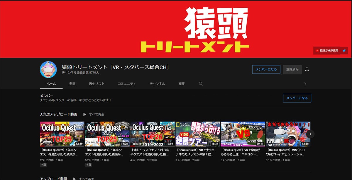 VRの虜になってしまった、とあるVR好きのお猿のチャンネルです。 バーチャル転生が好きすぎて、基本VRゲームをプレイしているときは、至福なのでご了承ください。 ただ、ゲームは下手です。かなりの頻度でやらがします。 主にMeta Quest2に関する情報、新作ソフトや、おすすめソフトをメインに紹介して行きます!