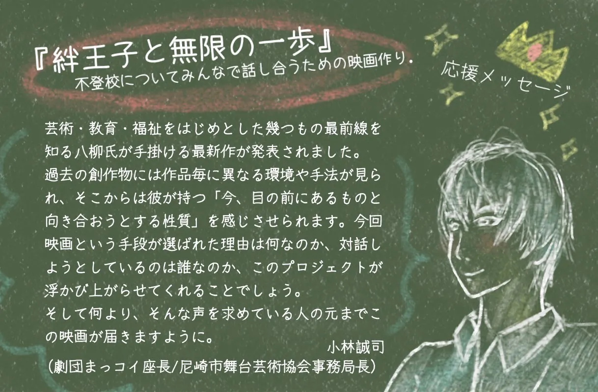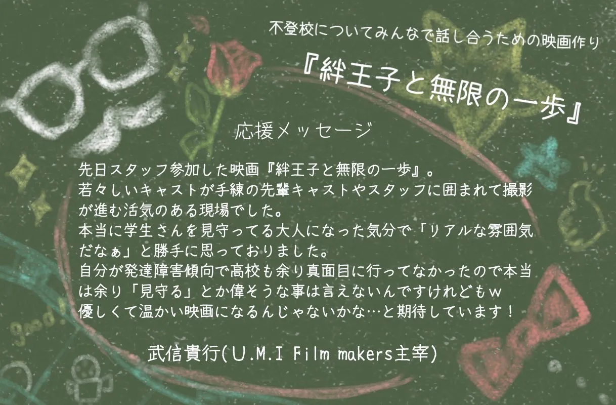 2022/10/09 23:39応援メッセージをいただきました!長袖の季節になってきましたね!八柳です!今回の映画作成に向けて映画監督でもあり舞台映像でもとてもお世話になっている武信さまと、発達障害を題材にした舞台『ヒバリは巣立っても、』に出演していただいている小林誠司さまより応援メッセージをいただきました!小林誠司さまより武信貴行さまより応援ボードはcOsmOsが作成しました!とまりぎでは~とまりぎは4人の企画集団です!僕は放課後等デイサービス、1人は医療関係、2人は大学生という別に本業をもっている集団ですし、それぞれに別の現場も抱えてたりします。ので、できることをやっています!今回の『絆王子と無限の一歩』では僕はプロデューサーとして事務方や広報の文章作ったり、りんだは役者をしたりインタビューを行ったりcOsmOsは楽曲作成や簡単なポスターを作ったり清原ふわりは取材記事の文章編集やビジュアル写真の撮影をしたりしています!代表の僕が集団行動とか指示だしとか得意なのではないのでゴタゴタはしている日もあるのですが、各自できることを一つ一つ、お互いのかなえたいことを叶えるために進んでいます!それぞれが何をやりたいのかは少し前に動画にしました!一つの目的のために団結した集まりっていうより「とまりぎ」っていうやりたいことを持ち合わせて集まった居場所って感じなのでできないことの方が多いのですが、少しづつ映画という新しいもののことへの知識や、それぞれのメンバーのやれることが増えたからこそ団体としてできることも増えてきて、自分たちのやりたいことも叶えつつ、誰かの応援に応えられるようになっていきたいです!不登校を題材にした映画『絆王子と無限の一歩』はまだまだクラファン実施中です!ご支援お願いいたします! もっと見る