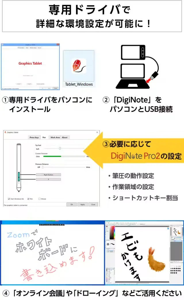 パソコンとUSB接続するだけで「手書き対応ソフト」に専用ペンで自由自在に書き込む事ができます。