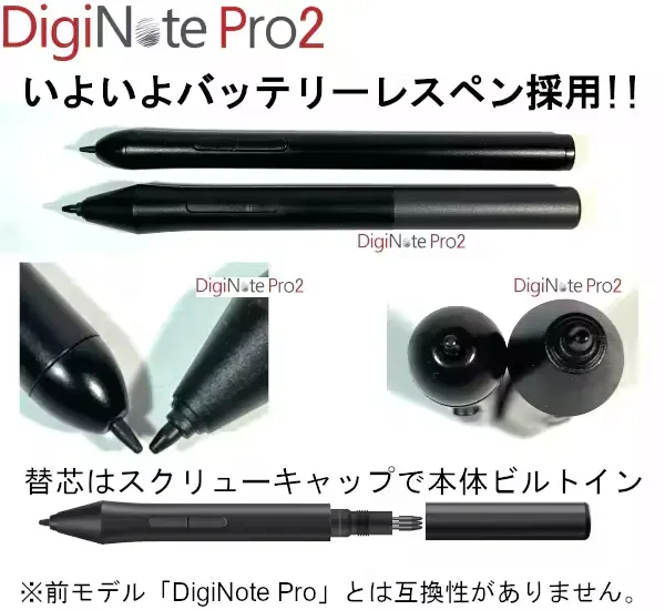 A.「DigiNote Pro」と「DigiNote Pro2」それぞれの専用ペンは互換性がなくお使いいただけません。 タブレット画面は筆圧を感知しますので、画面上に描くことは出来ますが、アプリやパソコンとの連動が出来ないということになります。