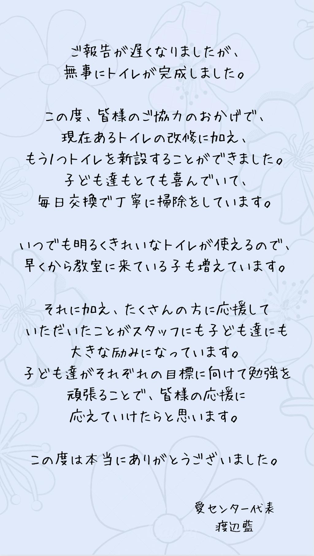2022/11/17 21:30大変お待たせ致しました!愛センター代表渡辺藍さんからのご報告にもあったように、トイレが完成致しました!改装に加えて、男女別のトイレを新設することが出来て、改めてご協力頂いた皆様に心より感謝しております。具体的に今回の工事では、・屋根の取り換え・電気の取り付け・壁の再塗装・ドアの鍵の取り替え・床の底上げ・水道の設置を行いました。支援内容になっていたホワイトボードにつきましては、愛センターの方で検討中とのことです。また追ってご報告させて頂きます。改めて本当にありがとうございました! もっと見る