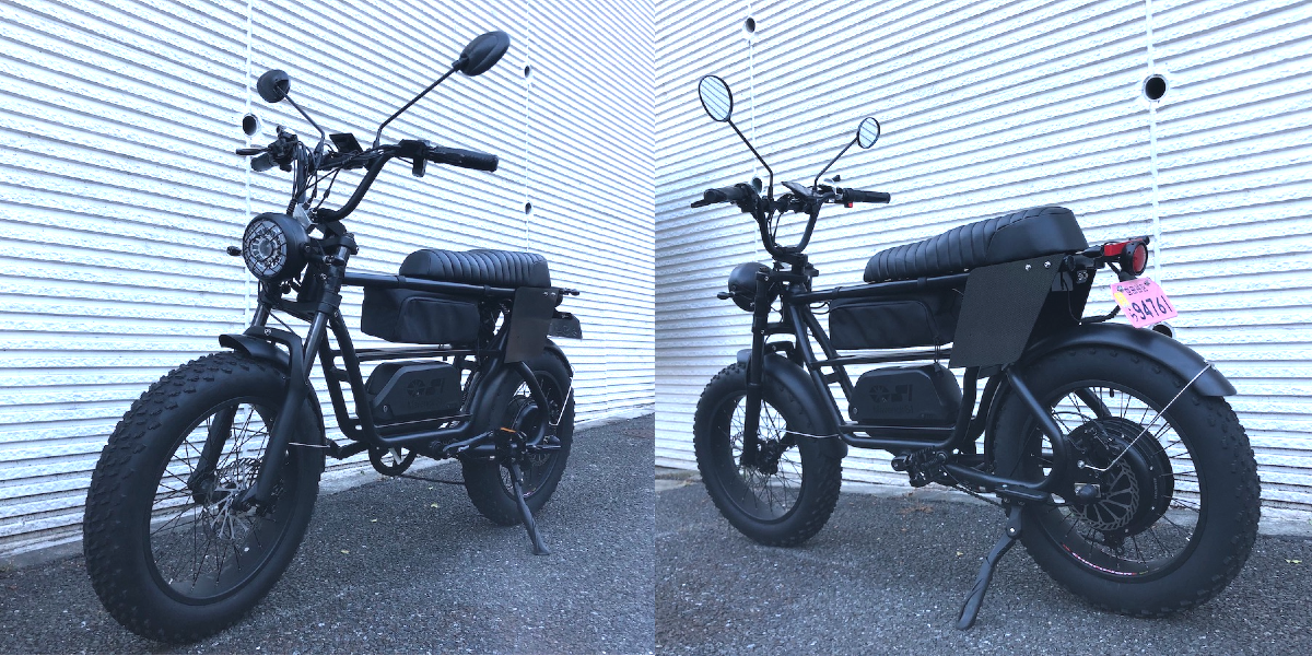 バイク本体の他、15Ahバッテリー(1個)と専用充電器(1個)が付属します。公道を走行するための保安部品は装着されています。PSEマーク取得済み。