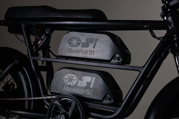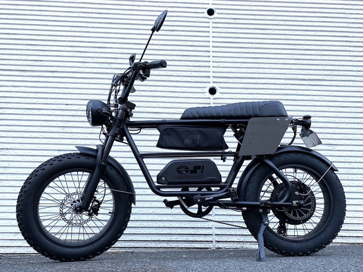 「S1-1000」は60V 1.0kWのインホイールモーター搭載した原付二種の電動バイクとして、2021年9月に発売されました。現行モデルのフレームやタイヤなどの基本パーツは変えずに走行性能を向上させたのが「マーベリックS1-1000RS」です。主な変更点として、従来の60V 1.0kWモーターを高速走行型のハイスピードモーターに変更した結果、最高速度は時速55kmから時速65kmになります。また、バッテリーは既存の60V 15Ah(900Wh)から60V 20Ah(1200Wh)に133%大きくなったロングレンジモデルも加わりました。ロングレンジバッテリーを2個搭載した場合、40Ahという大容量となり140キロの航続距離を実現します(時速30km走行時)。