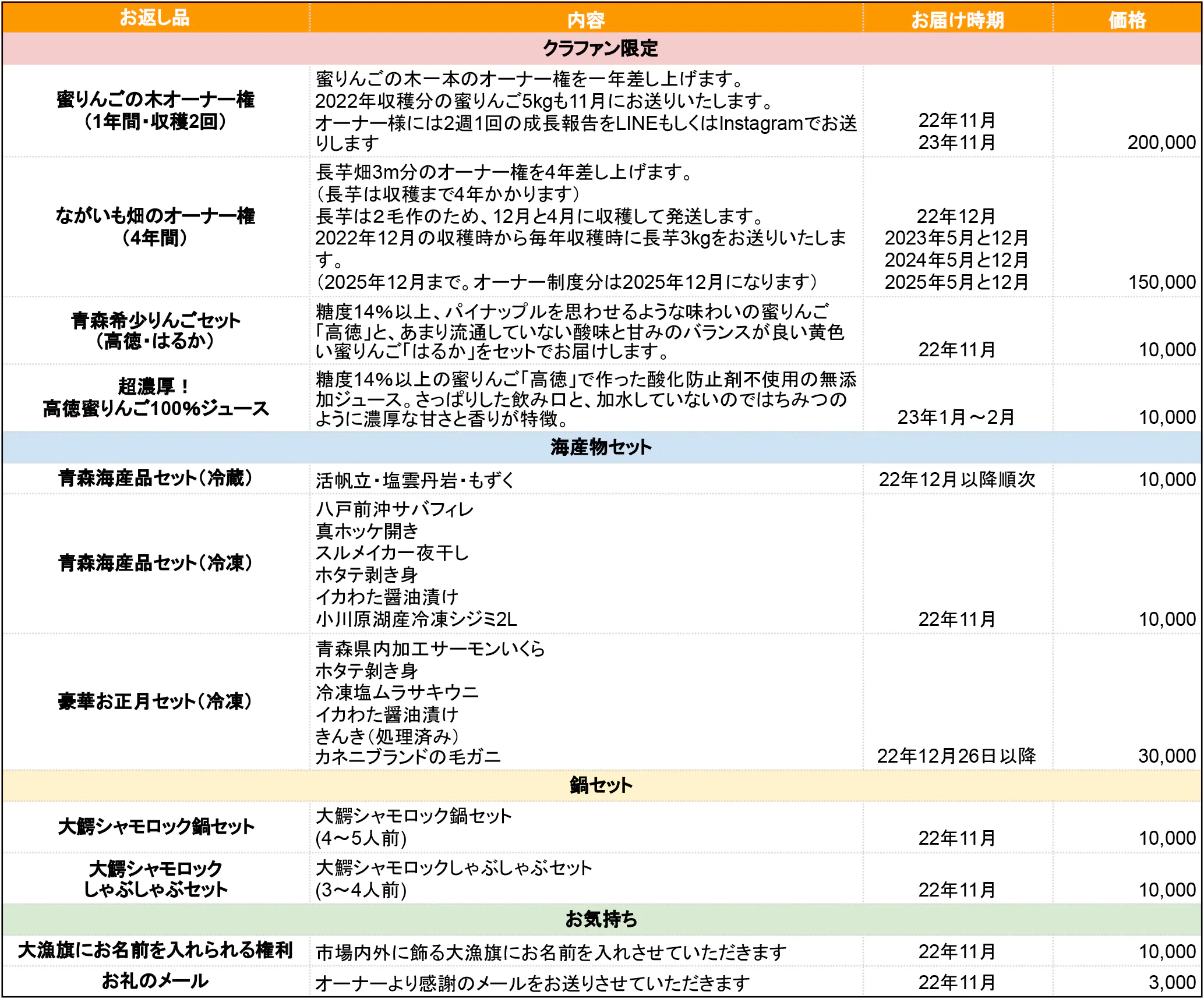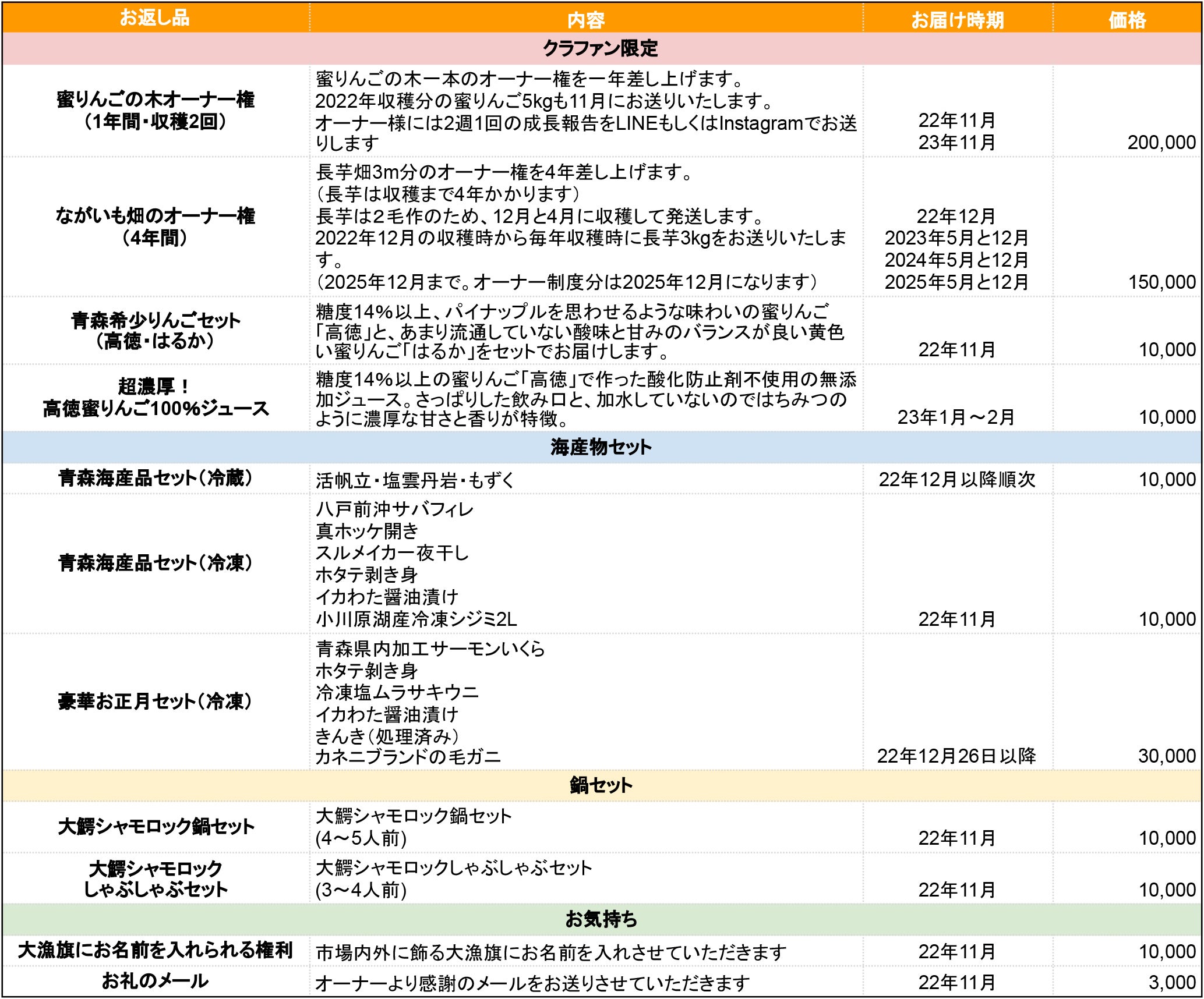 地元の農家さんのご協力のもと実現した、「蜜りんごの木のオーナー権」「ながいも畑のオーナー権」「青森りんごセット」「超濃厚!高徳蜜りんご100%ジュース」のリターンは今回のクラウドファンディング限定でしか手に入らない特別なリターンです。