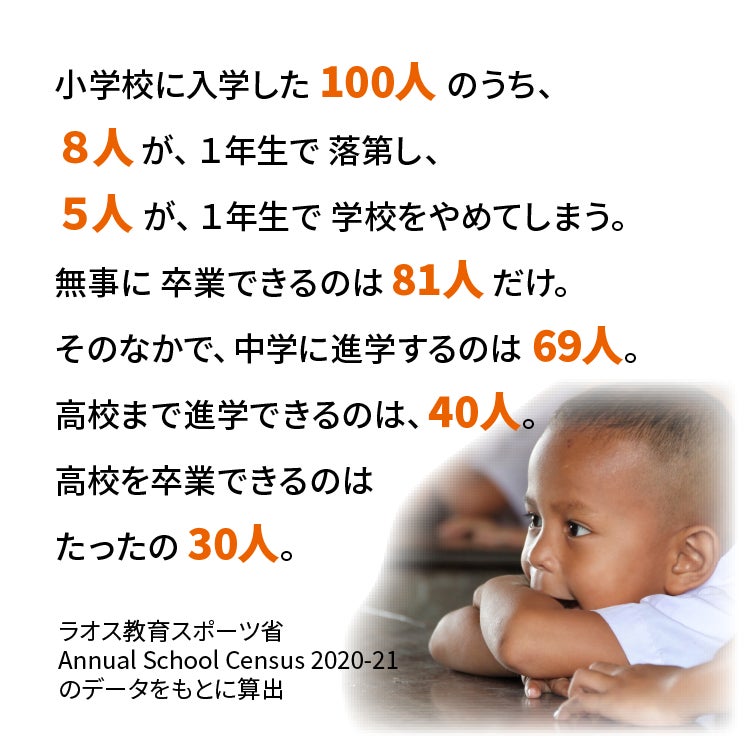 今でこそ小学校の入学率は100%近くになっていますが、ラオスの学校には進級試験があり、試験をパスしないと進級できません。小学校に入学した子どものうち、無事に卒業できるのは80.7%、1年生のうちに13.7%の子どもが授業についていけなかったり、家庭の事情で、落第したり退学してしまいます。義務教育の中学校を卒業できる子どもが、半分に満たないのが現状です。