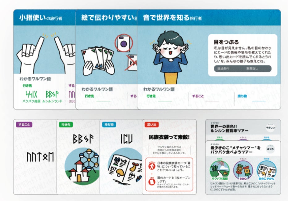 ワンダーワールドツアーでは架空「ワルワン国」に旅行に行くため、現地の架空の言葉でツアーカードを表現しています。ツアーカードは文字のみで表記したものとイラスト付きで表現をしたものを作っており、絵や図で伝えることは誰にとってもわかりやすいことが体感できるようになっています。
