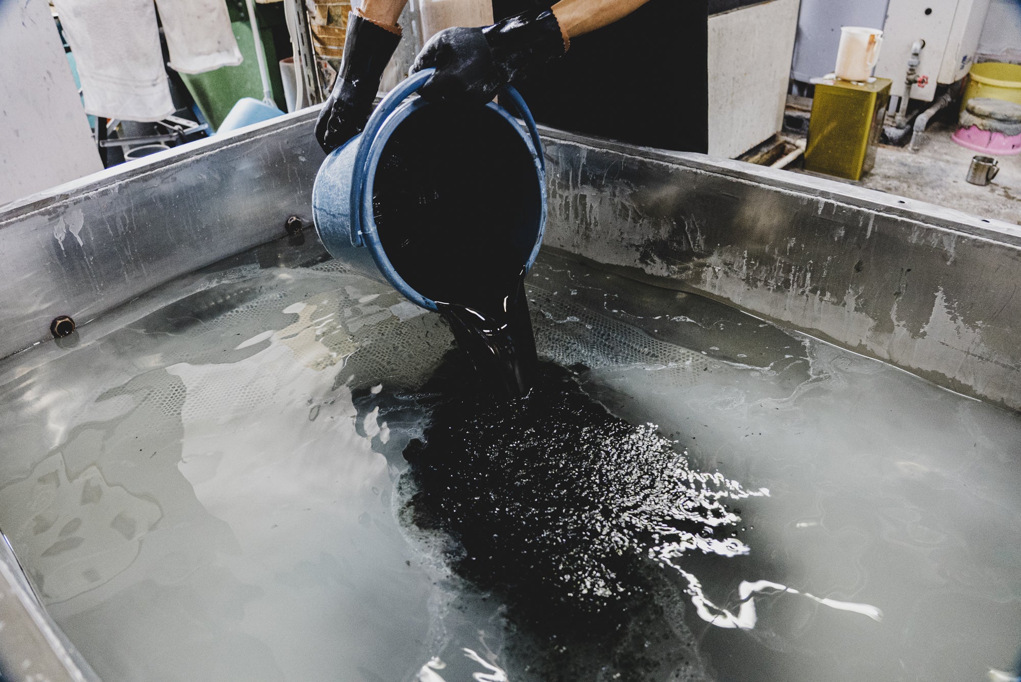 「洗い」が終わったら染料の調合です。複数の染料を使用し狙った色に染まるよう調合を行います。