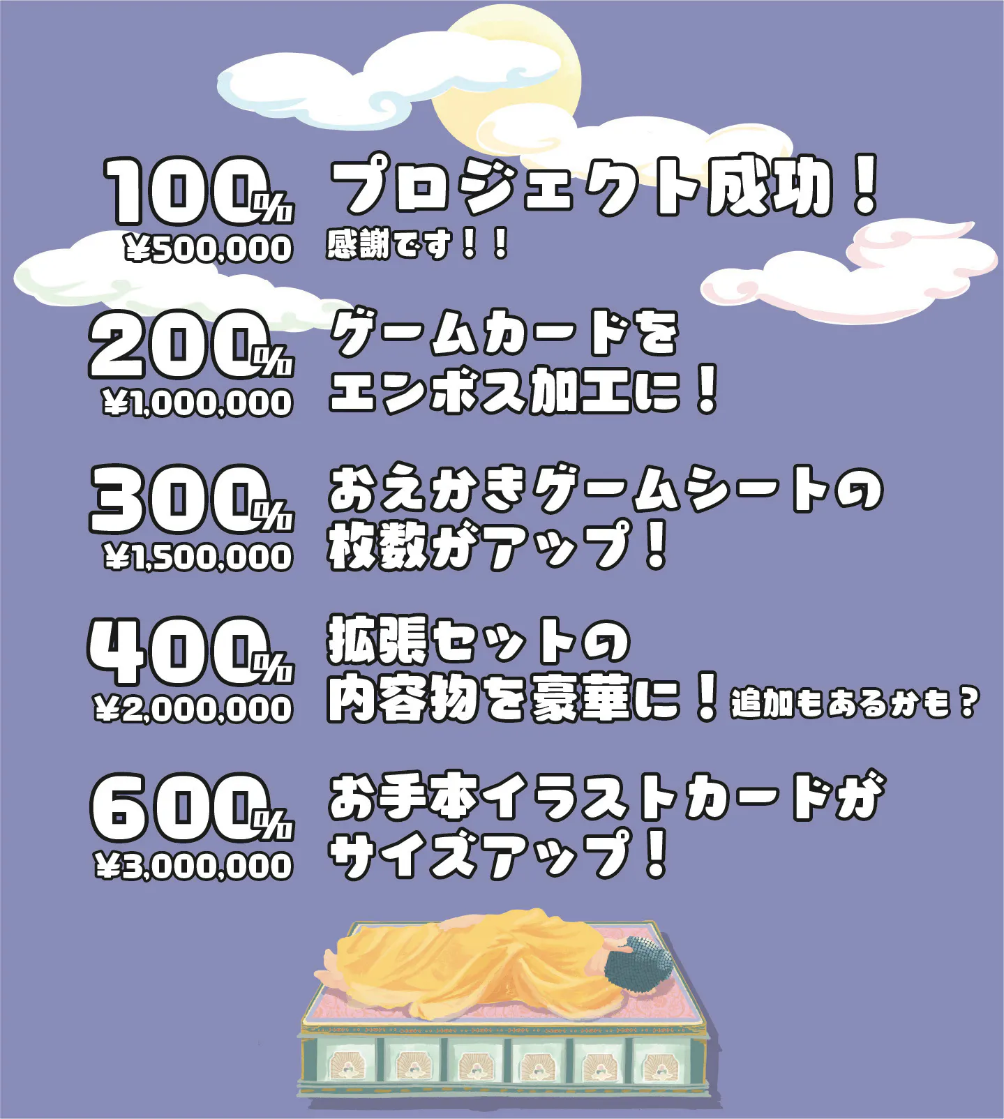まだまだ日程がございます。つづきまして100万円を目指したいと存じます。そこまでいけましたらば、基本セットや拡張セットが想定以上にクオリティの良いもの、中身を増やしたりもできます。