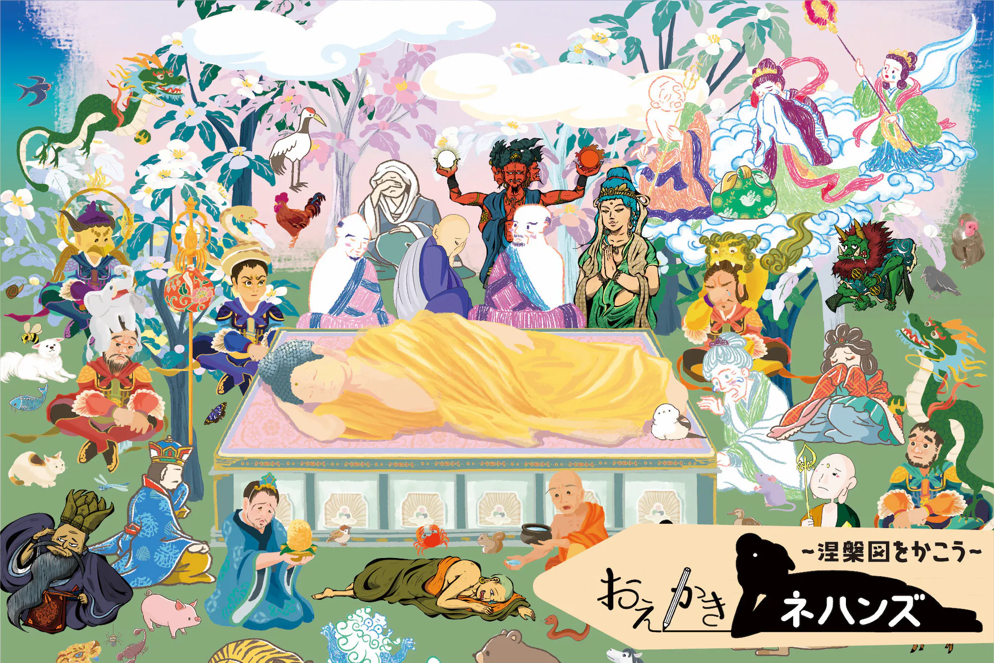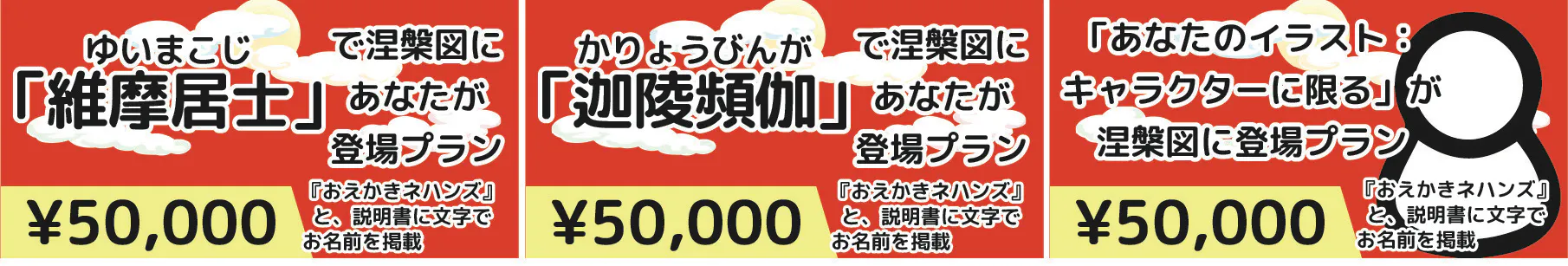 ・¥50,000◯「あなたのイラスト:キャラクターに限る」が涅槃図に登場プラン:『おえかきネハンズ』基本セット・拡張セット 各1個(送料込み)と、説明書に文字でお名前を掲載。