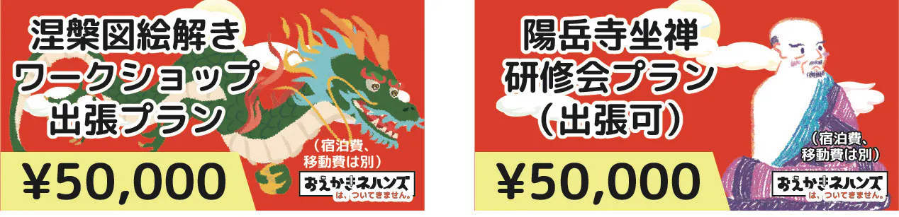 ・¥50,000◯涅槃図絵解きWS出張プラン:起案者向井が、あなたのご希望の日時や場所で「涅槃図絵解きワークショップ」を出張して行います。開催時期や内容などは相談いたしましょう。(移動費、宿泊費は別)(有効期限:2024年2月末まで)(『おえかきネハンズ』は含みません)