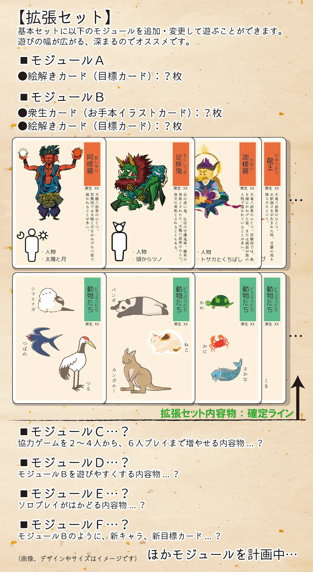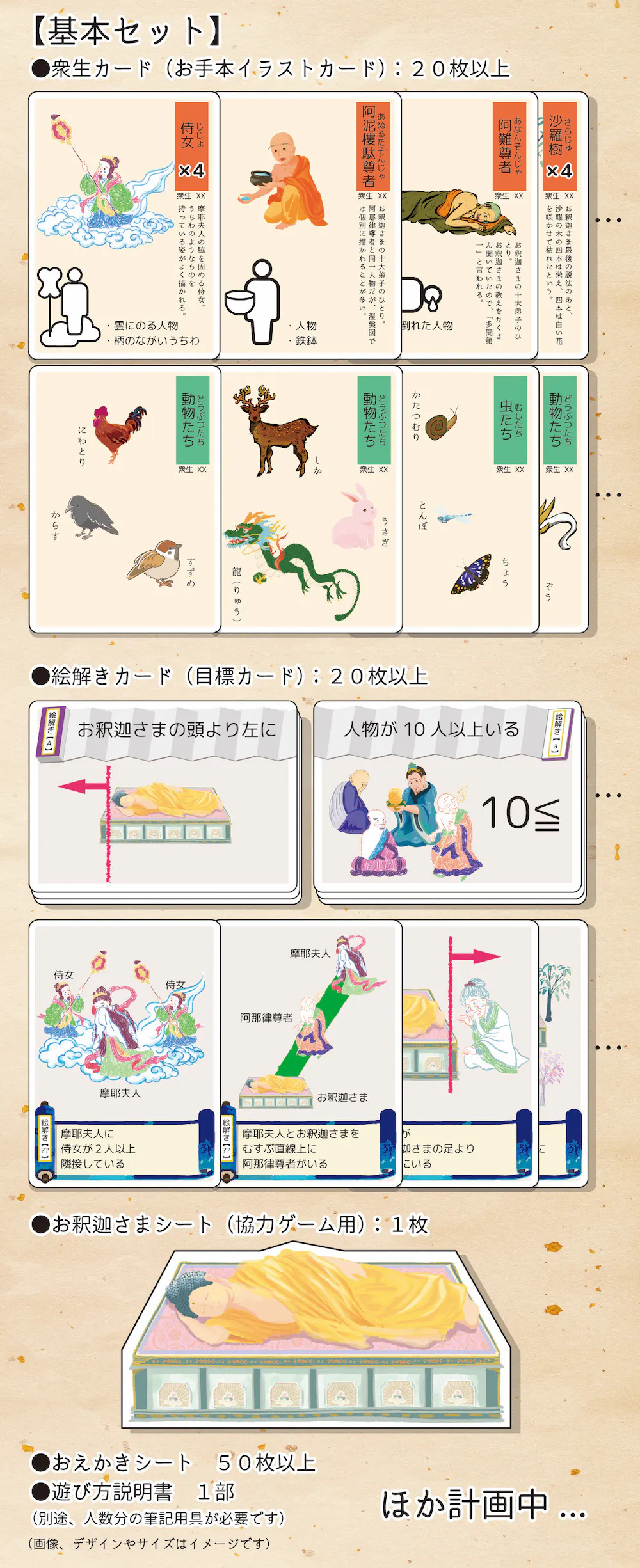 拡張セットをお求めいただきますと、目標カードを増やすことで着眼点が深まったり、お手本イラストカードと目標カードの組み合わせを増やすことでリアル涅槃図により近づけることができたり。ほかにも・・・