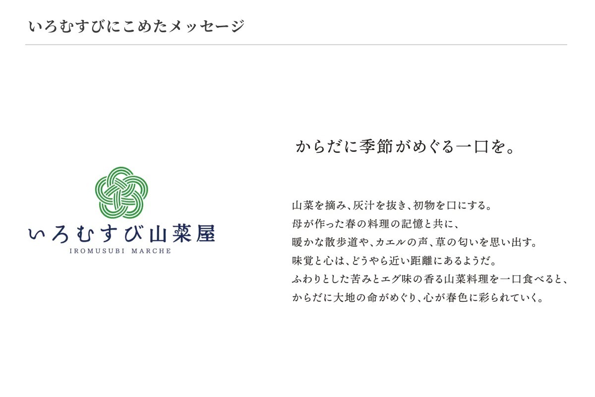 皆さんにもう一度、私たちの天然山菜をお届けしたい。食べた瞬間に、心が彩り豊かな春に変わるような、苦味。かかさ(お母ちゃん)の真心こもった天然山菜をお届けしたい。