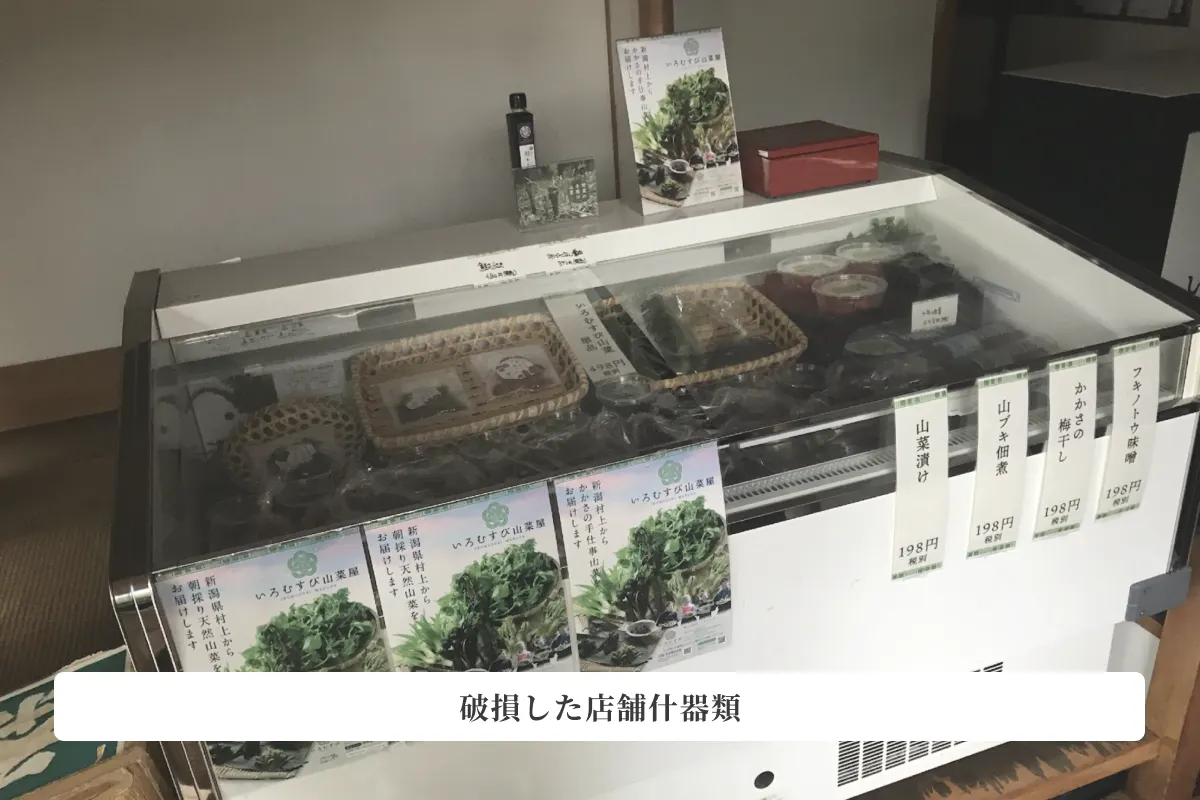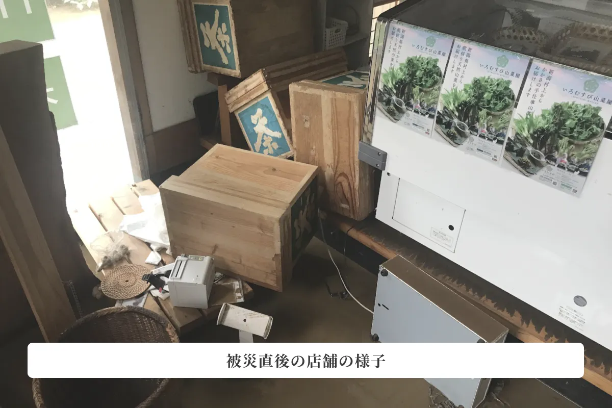 床上60センチの泥水浸水により、冷蔵ショーケース、空調設備、店舗什器、店舗内装、ギフト用梱包資材、キッチンカーは使用が不可能に。