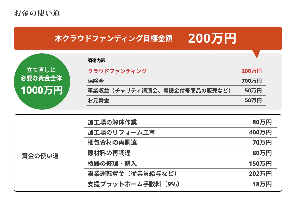 再建資金のうちの200万円を、今回のクラウドファンディングで募りたいと考えています。