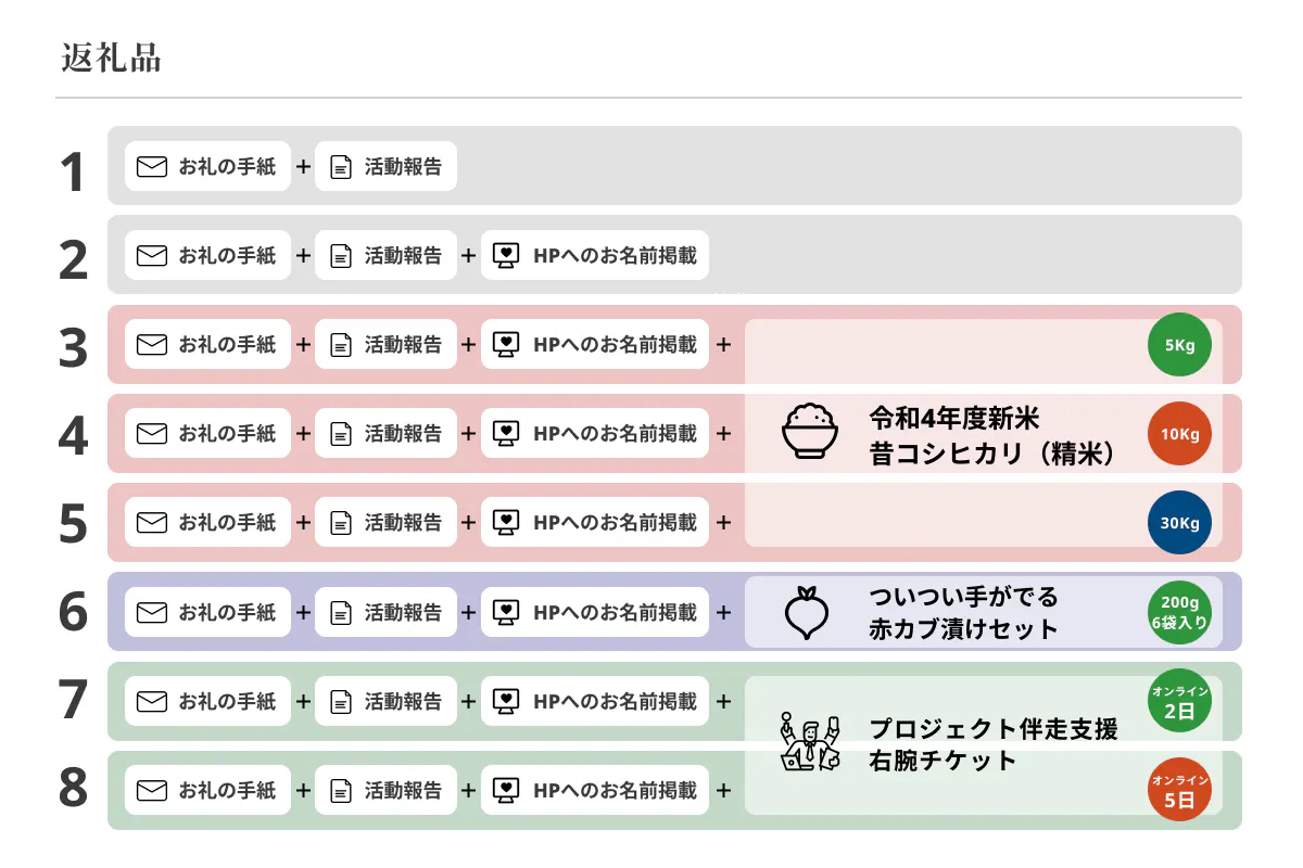 今回ご支援いただきますみなさまに、ご支援金額ごとに8種類の返礼品をご用意させて頂きました。