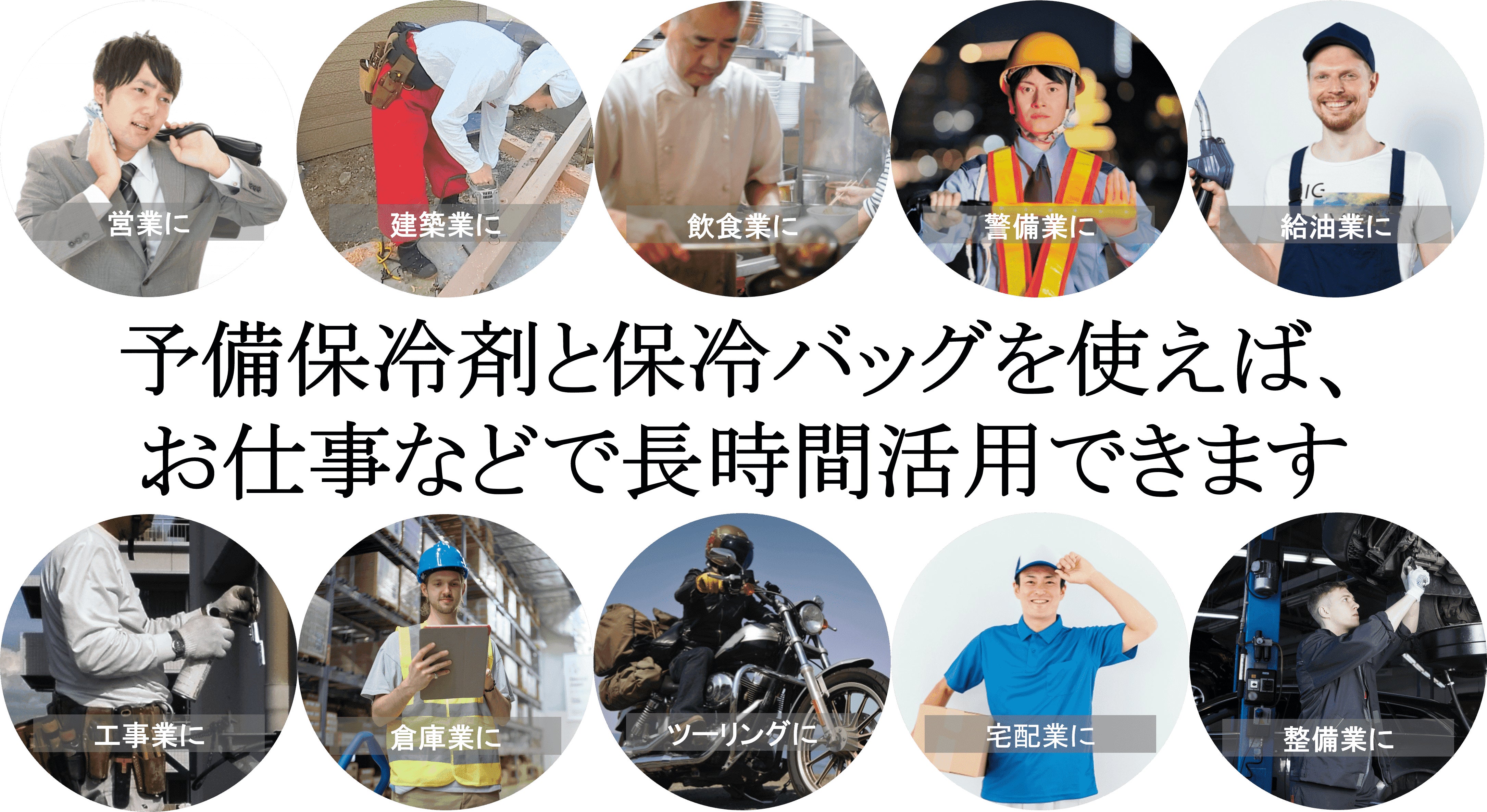 さらに、同梱のスペア保冷剤と保冷バッグを使用することにより、長時間の屋外でのお仕事にもご活用いただけます。