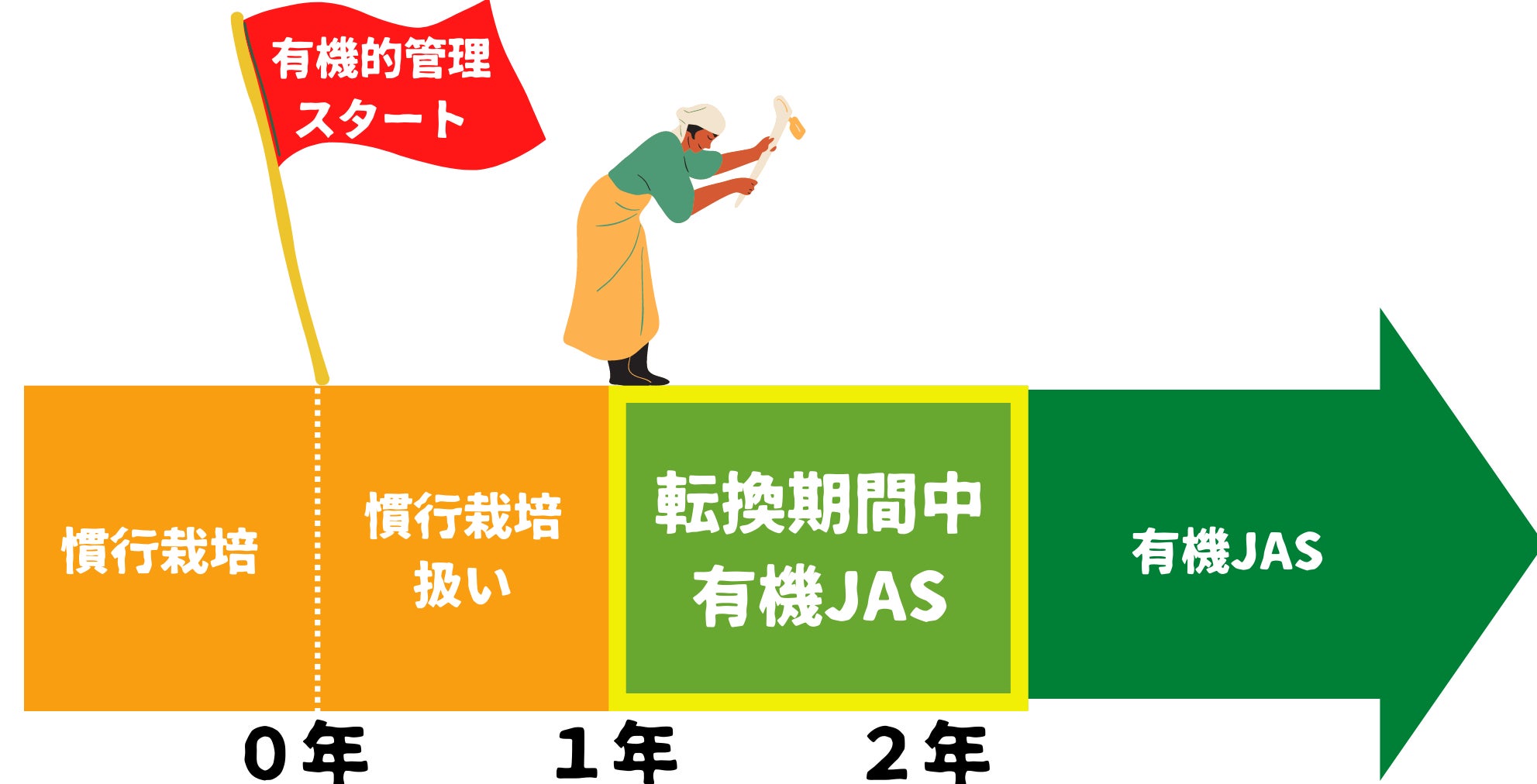 オーガニックの需要は日本でも少しずつ高まってきている一方で、有機農家さんがなかなか増えない、のが大きな問題です。その大きな原因の1つに、有機JAS認証がおりるまでの約3年間は耕作地で有機的管理をしっかりしていても、「転換期間中」有機という基準になり、販売先が見つからない恐れがあるということが挙げられます。
