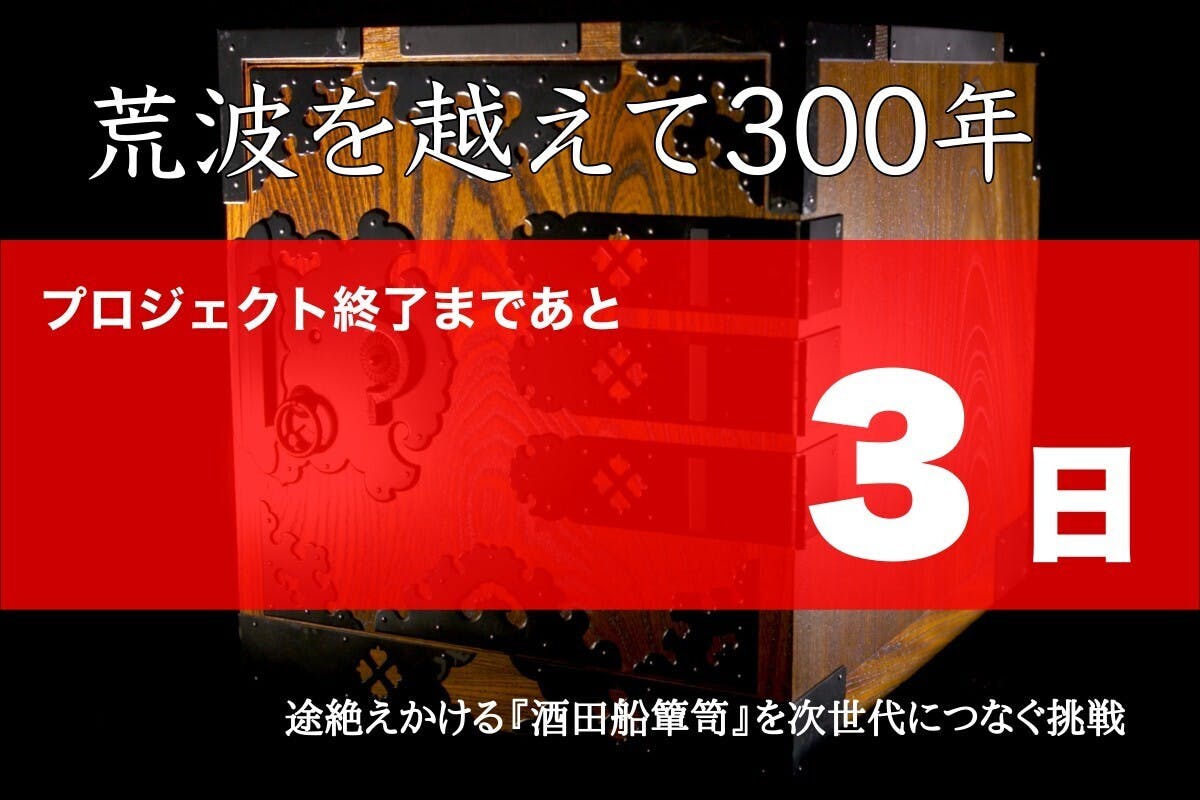 2023/01/28 21:00多くの方にご覧頂き感謝致します。酒田船簞笥は50年前に比べ、認知度は低迷しております。認知度の低さからプロジェクトの実施に不安を抱えていましたが、多くの方に支援頂けて本当に感謝しています。プロジェクト自体は残り3日とはなりましたが、私の挑戦はその後も続きます。今後の挑戦にも期待頂ければ幸いです。◆お知らせ◆プロジェクト終了後の詳しい挑戦内容は、ご支援頂いた皆様に限定公開とさせて頂きます。 もっと見る