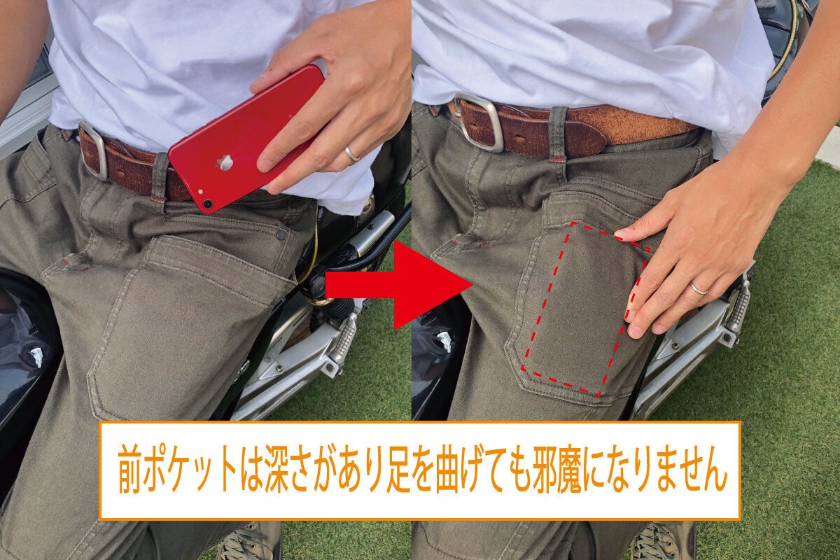 ポケットを深くすることで、物を入れて乗車しても、物が脚の付け根に当たりにくく、ライディング時にも足の動きを妨げにくい設計です。