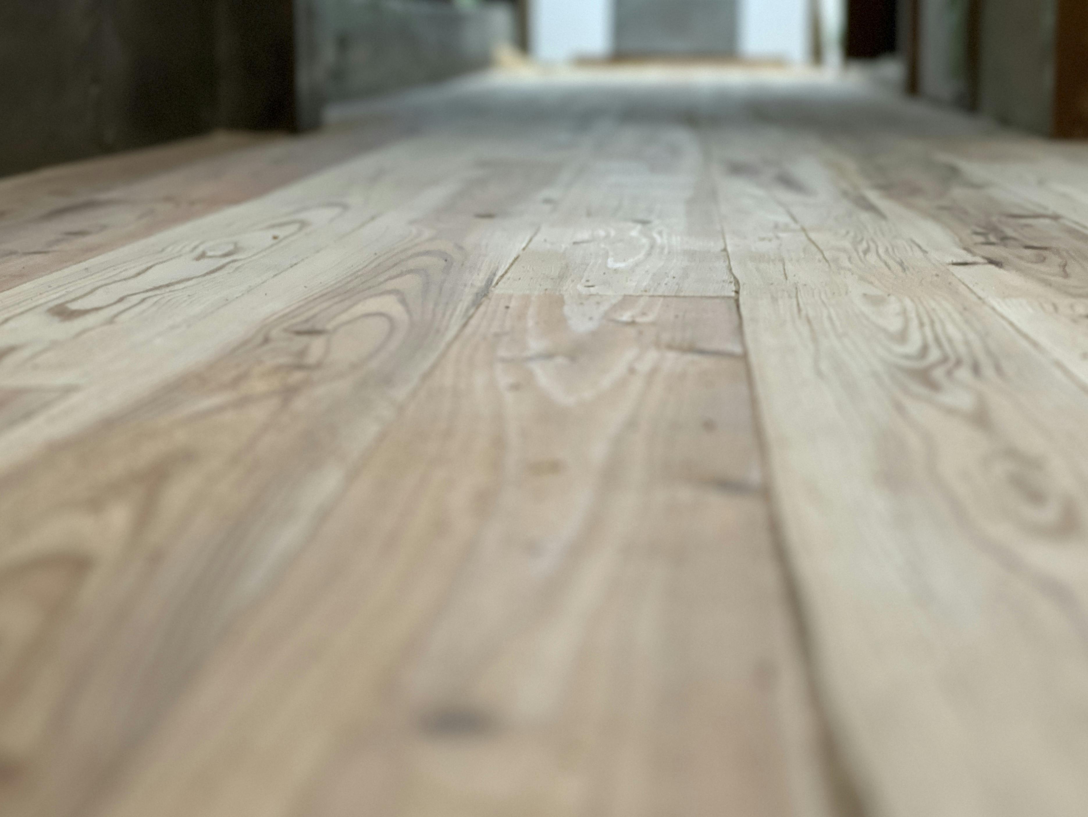 ①皮むき間伐で乾燥させた間伐材を床材として、共用の廊下部分に使用します。