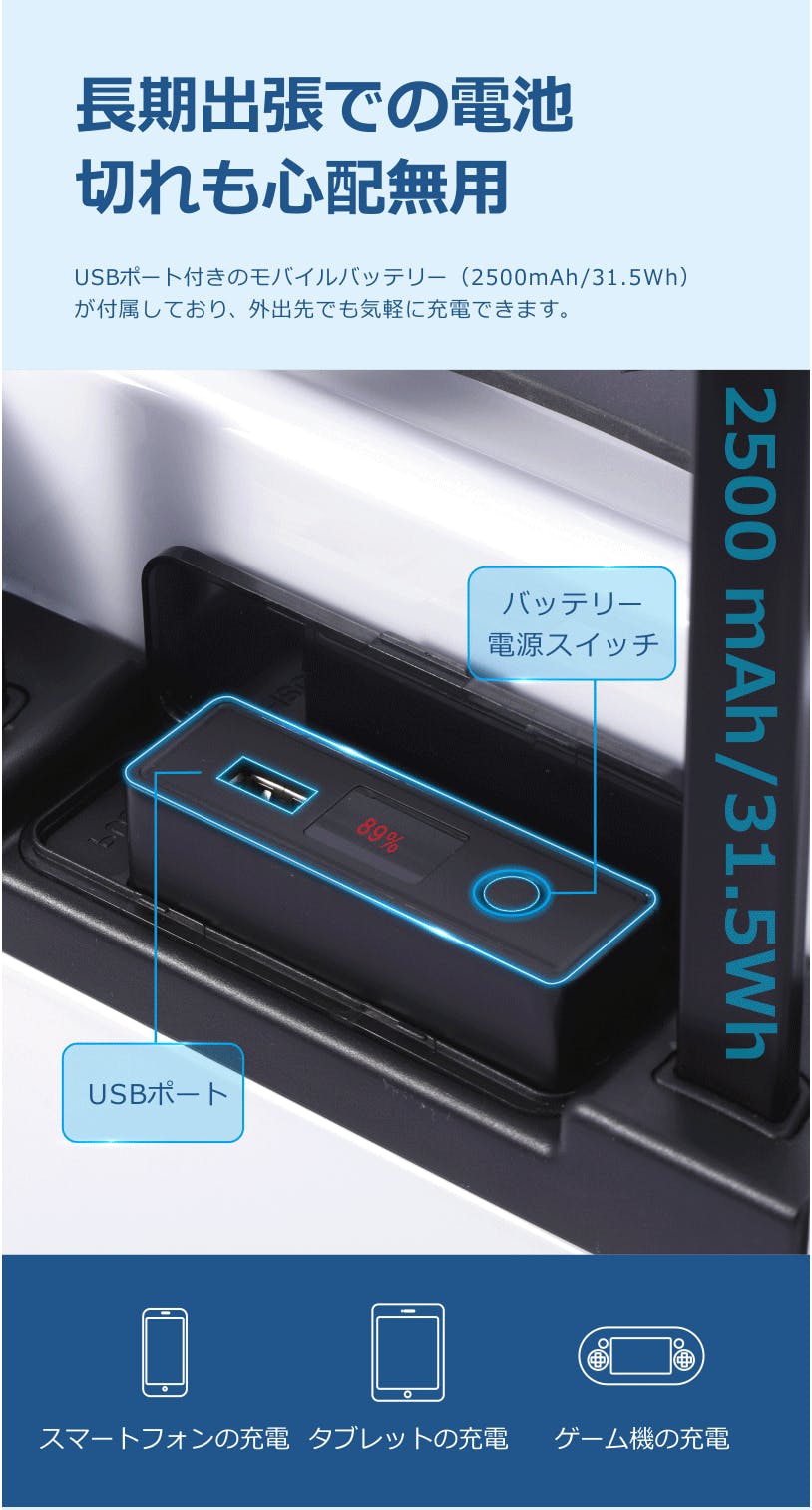 MOOBOTはさらに大容量な着脱式バッテリーを装備しております。スーツケースのアシストだけではなく、スマホ、タブレット、ゲーム機への充電も可能です。