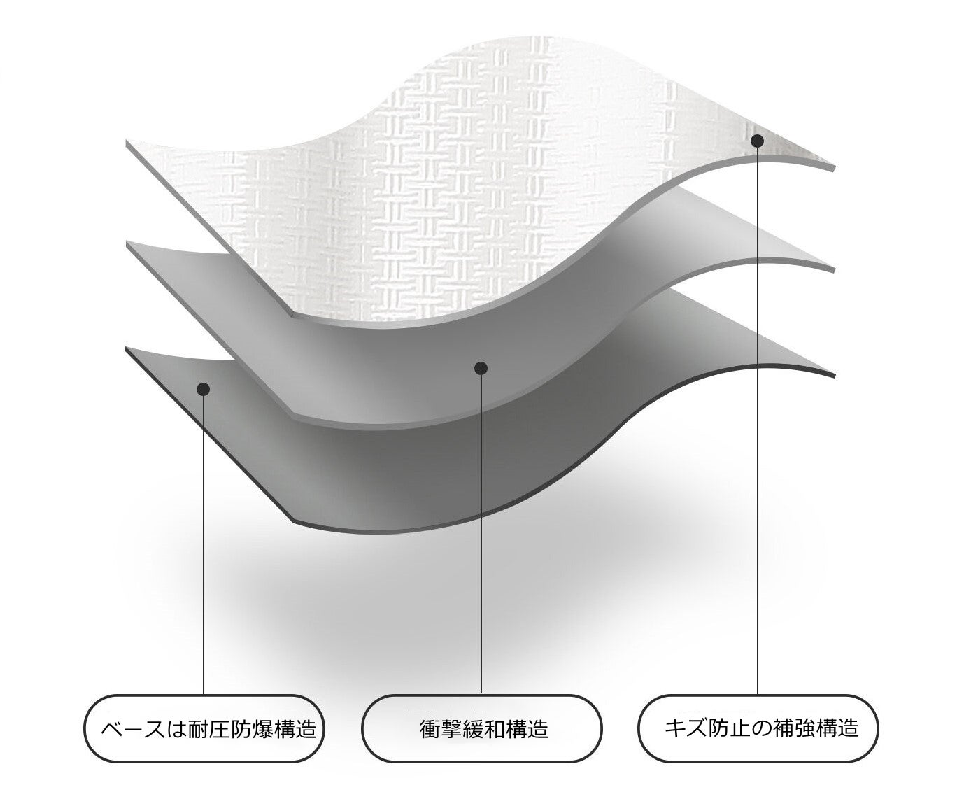 ポリカーボネートはABS樹脂に比べ、高い耐衝撃性を持ち、低温・高熱にも強いです。また劣化しにくいので、変形のリスクを軽減することができます。一般的には、ドイツのバイエル社製のポリカーボネートが高品質と言われています。3層構造のポリカーボネートは、高い耐衝撃性を持ちます。