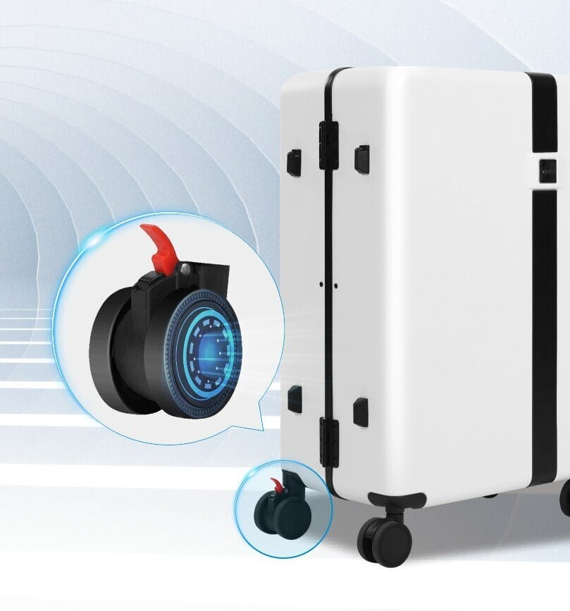 まずは、3回も進化を遂げたモーターキャスターです。最初はAI自動追尾キャリーケースと同じモーターキャスターを採用しました。しかし、そのキャスターはパワーは大きいものの重く、360度回転することができませんでした。そのため、私たちは2回目の研究開発に挑みました。それはどの方向でも固定できるワンタッチで切り替えができるというものです。ところが、電源が入っている状態でスーツケースの走行が止まると、キャスターから大きな音と振動が生じてしまいます。そこで、私たちは2回目の開発結果に基づき、センサーを追加しました。そうすることで、キャスターが止まった時に自動認識ができるようになります。アシストを停止させることもできます。こうして、電源を切った時に生じる騒音と振動問題を解決しました。それが今回のモーターセンサーキャスターです。