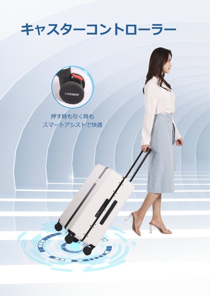 出張や旅行の時、荷物を詰んだ重いスーツケースを持って移動するのは大変ではありませんか?そんなお悩みをMOOBOTが解決してくれます!MOOBOTは力を入れず簡単に引いたり押したりすることができるスーツケースです。スーツケースを軽く引くだけで、MOOBOTは自動的にアシスト機能を起動させ、走行をラクにしてくれます。