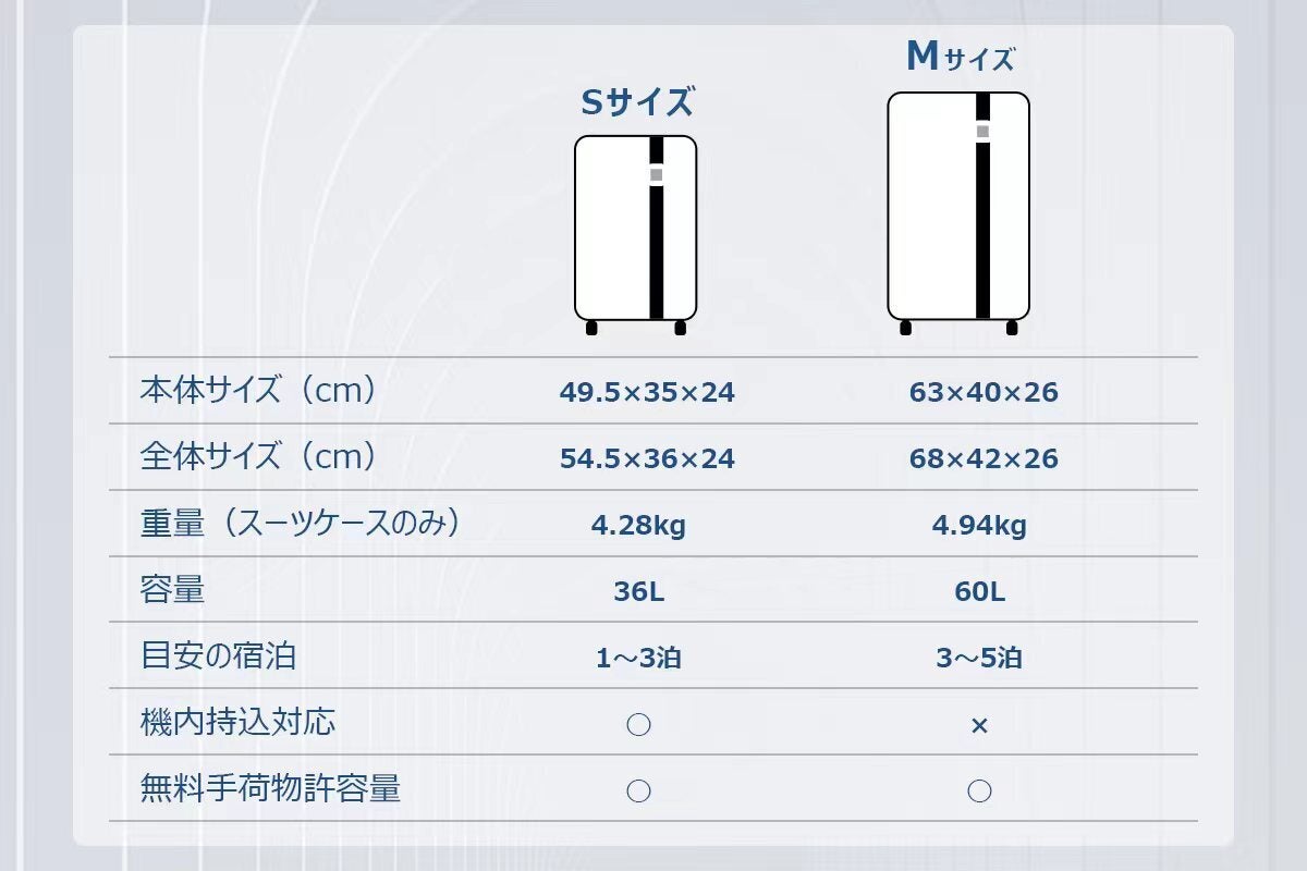 Sサイズは機内持ち込み可能です。Mサイズはお預け手荷物になります。また、内蔵のバッテリーは外して携帯する必要があります。