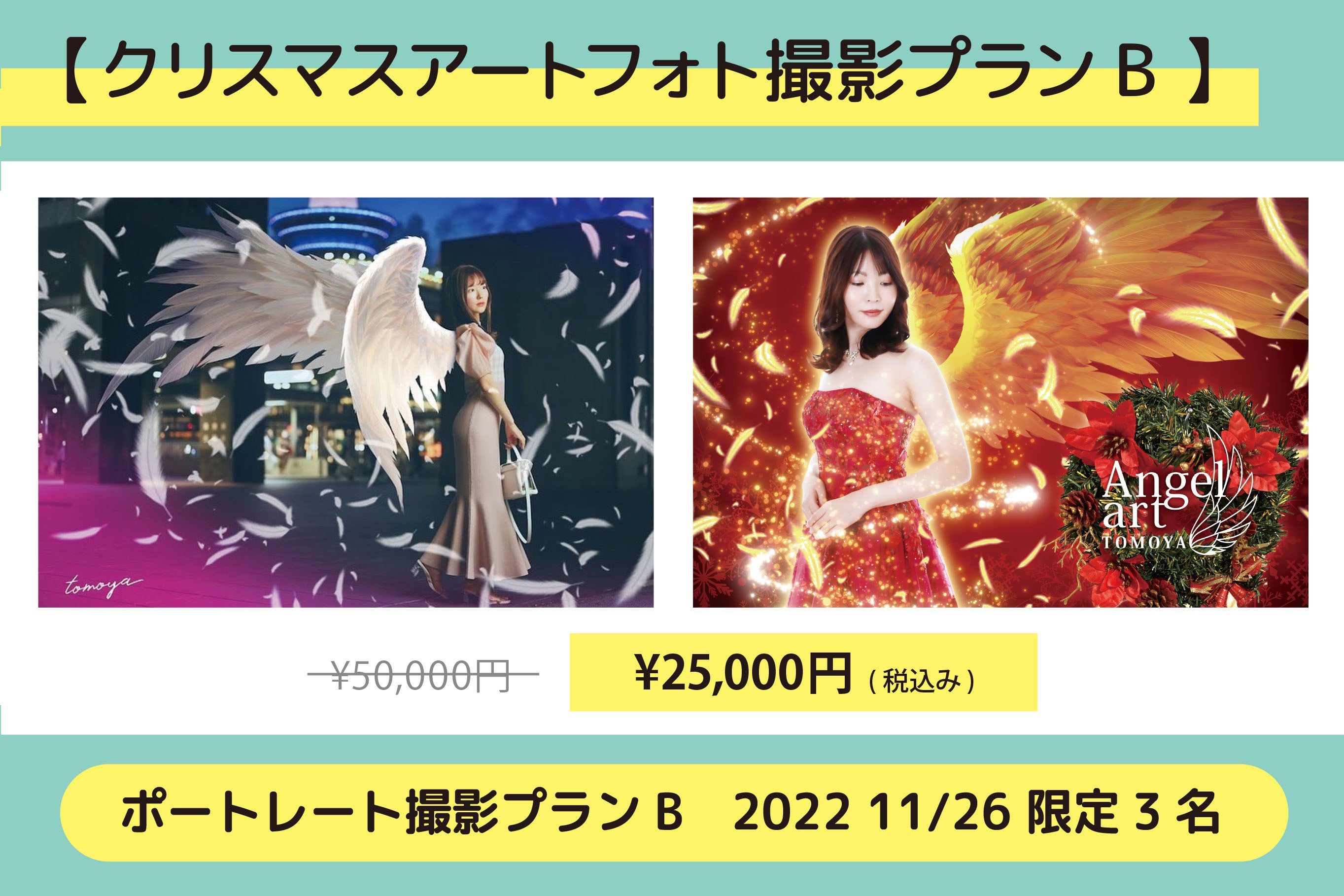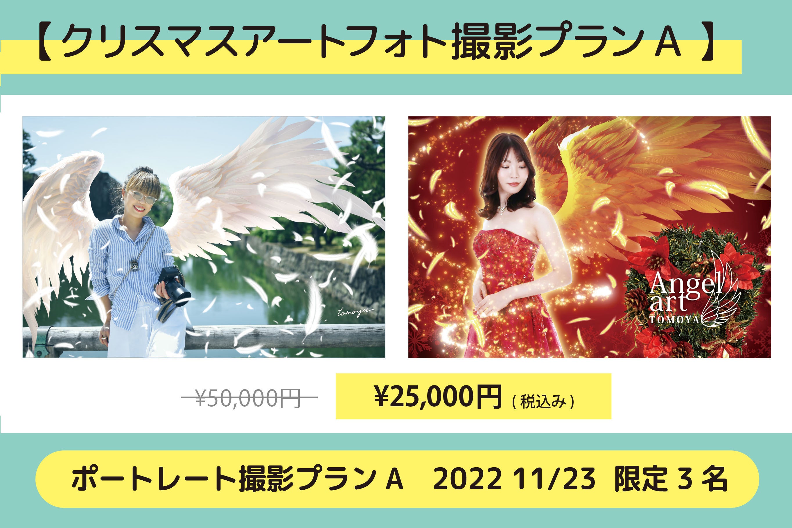 ※今回のクリスマスアートフォト撮影プランでは、通常の撮影+写真の中の1枚に翼を付けクリスマス仕様にデザインします。