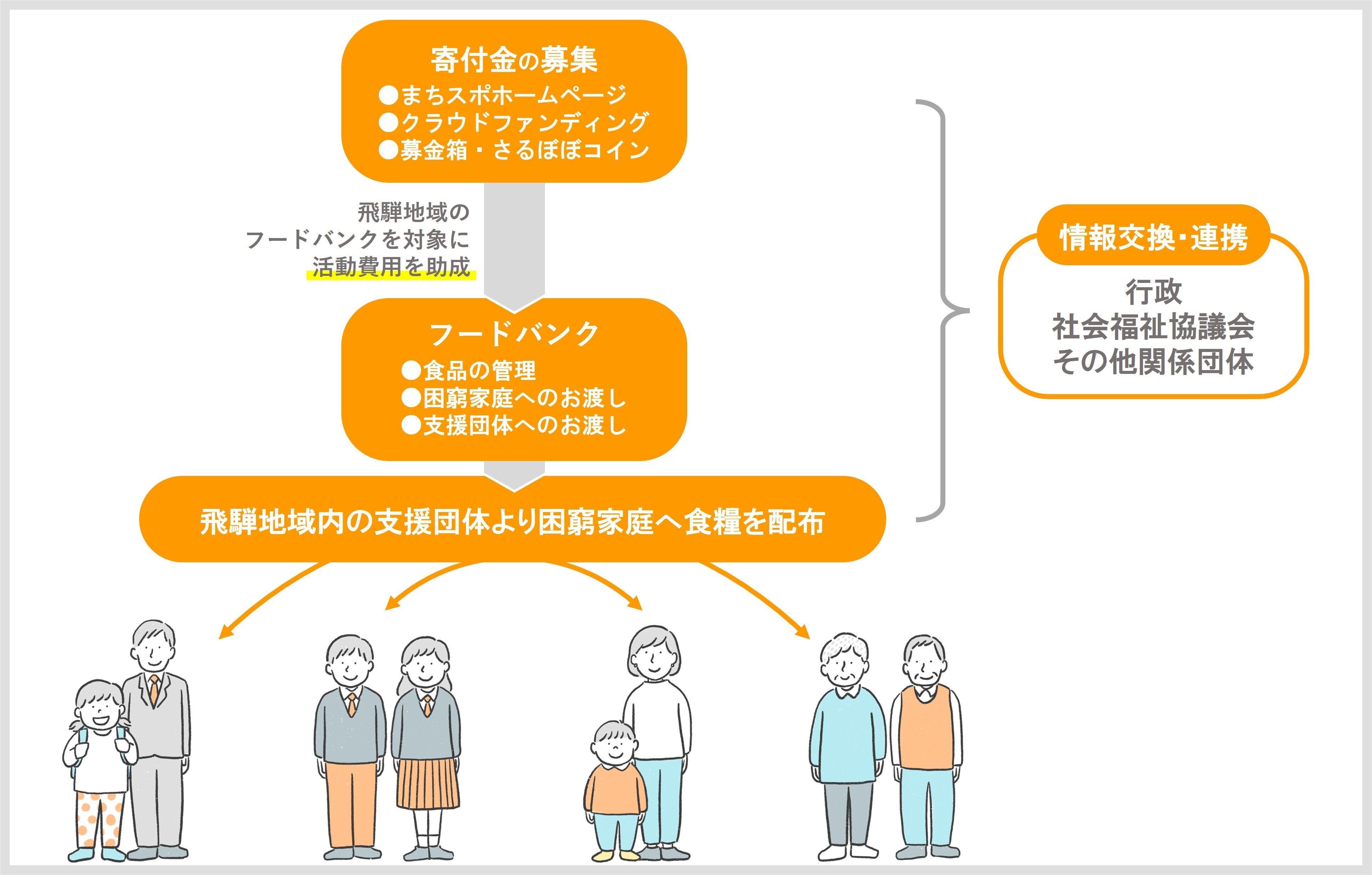 飛騨地域では、フードバンクだけでなく、様々な支援団体が困窮家庭へのサポートを行っています。このような民間の団体と行政や社会福祉協議会などの公共的な団体と情報交換・連携をとりながら、困窮家庭のSOSに対応しながら自立支援をしていきます。