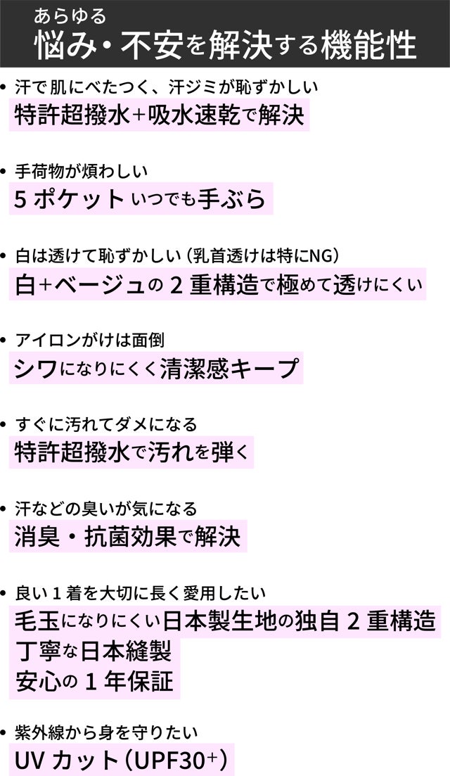 この弱点に関しては、2重構造にするメリット(極めて透けにくい・超撥水&吸水速乾・汗ジミ防止・耐久性向上など)の方が大幅に価値があると判断し、役立つ機能性を一つ一つ丁寧に取捨選択しました。