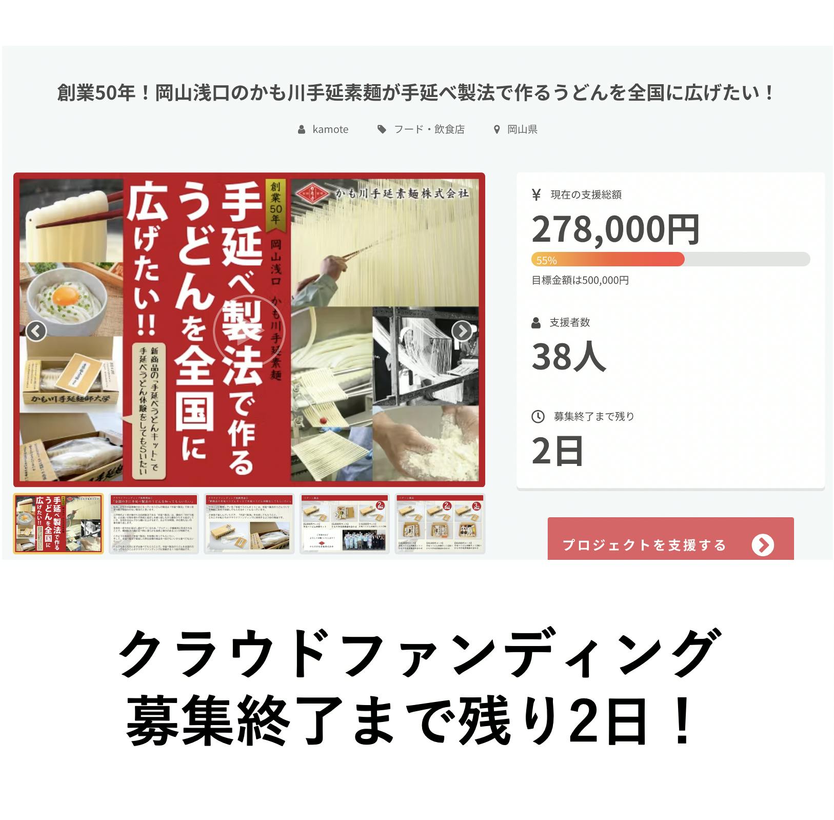 かも川手延素麺より皆様へ!vol.20『クラウドファンディング終了まであと2日』