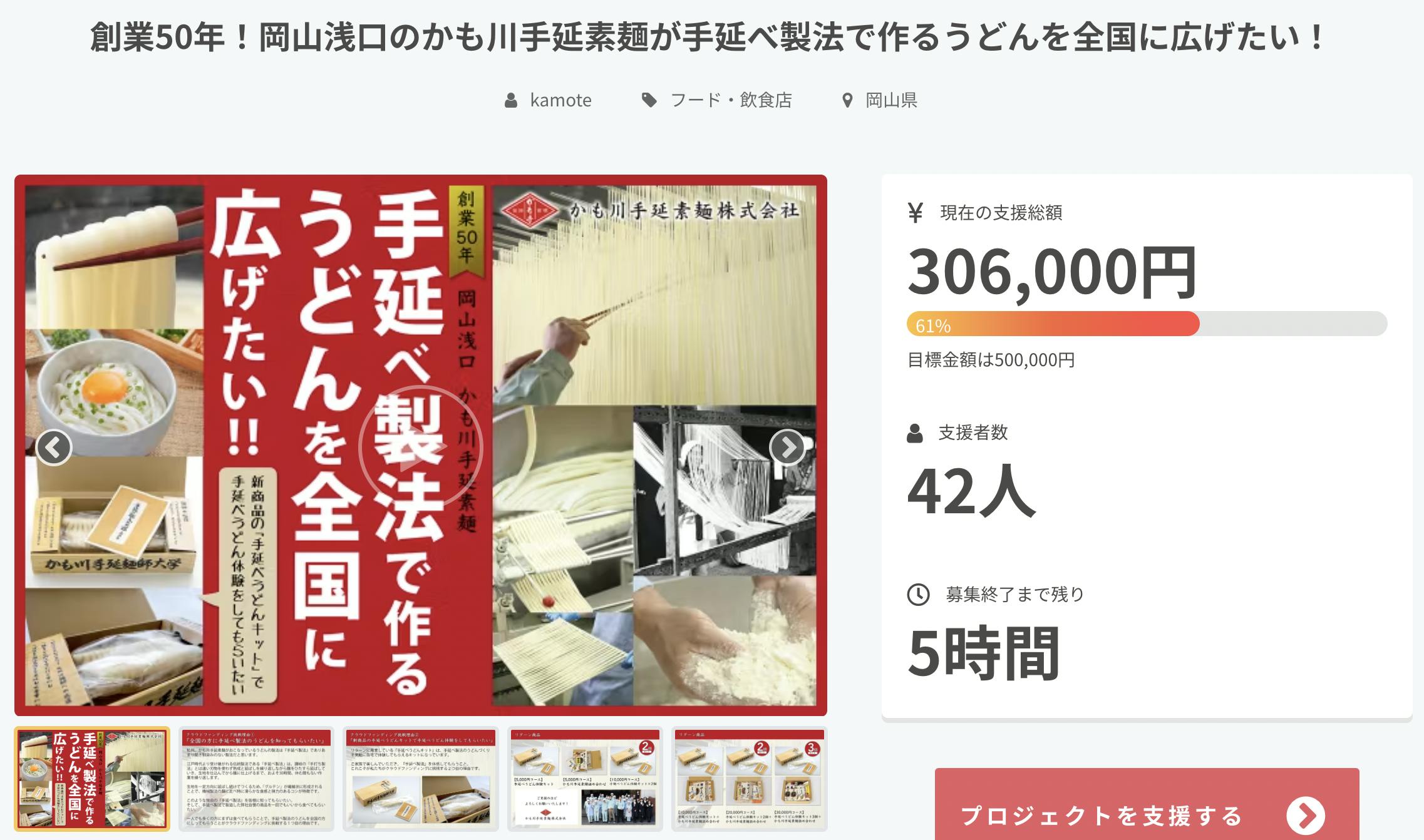 2023/01/29 10:18お世話になっております。かも川手延素麺のクラウドファンディングを見てもらいありがとうございます!2022年12月15日にスタートしたクラウドファンディングも早いもので、募集期間の残りがあと4日となりました(1月31日まで)!先日の投稿より1.5万円のご支援を頂戴しました!皆様本当に有難うございます!【現状】目標:50万円実績:27.8万円(達成率:55%)不足:22.2万円泣いても笑っても残り2日+14時間程度です!最後までしっかり告知していきますので、応援のほど何卒よろしくお願いいたします。 もっと見る