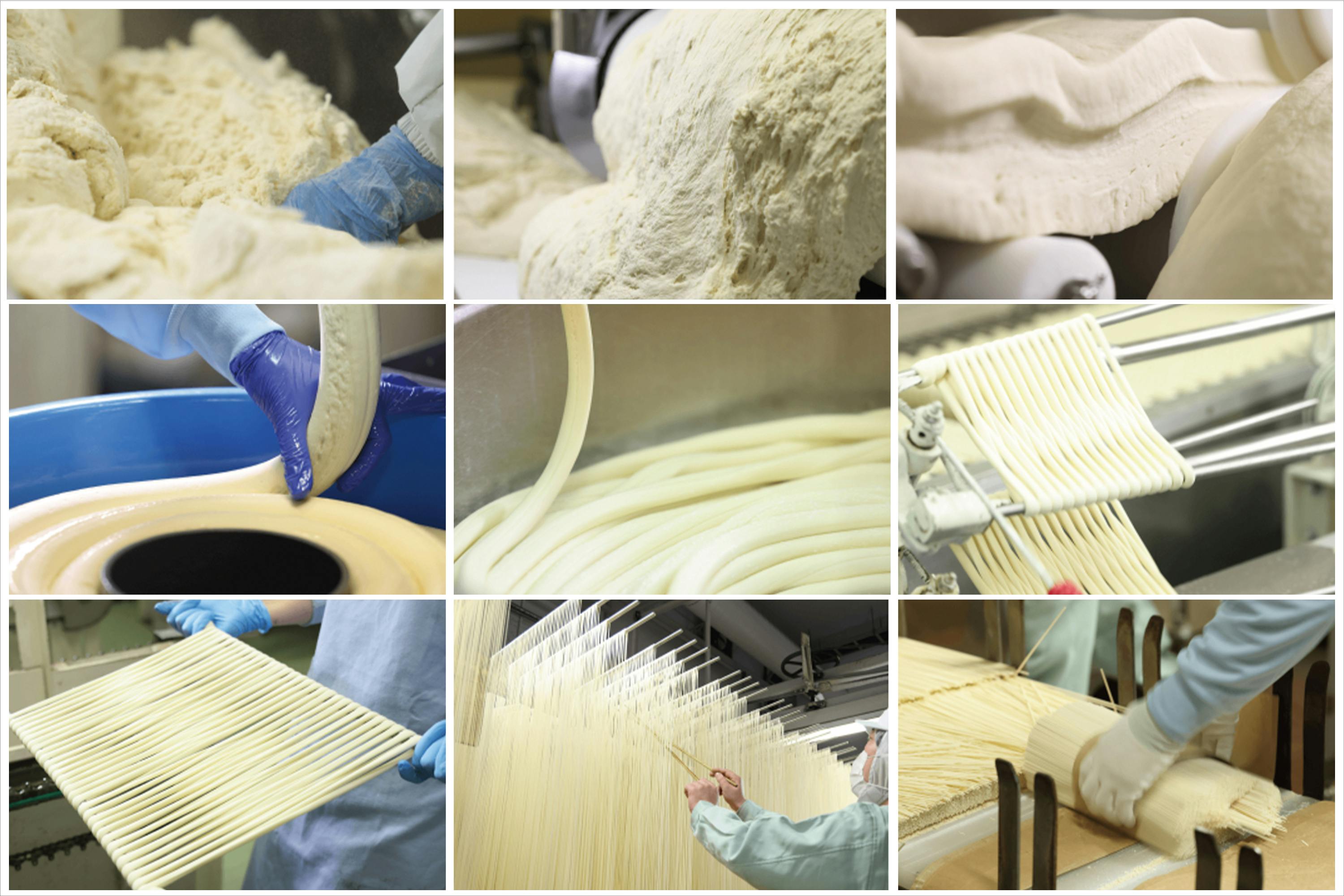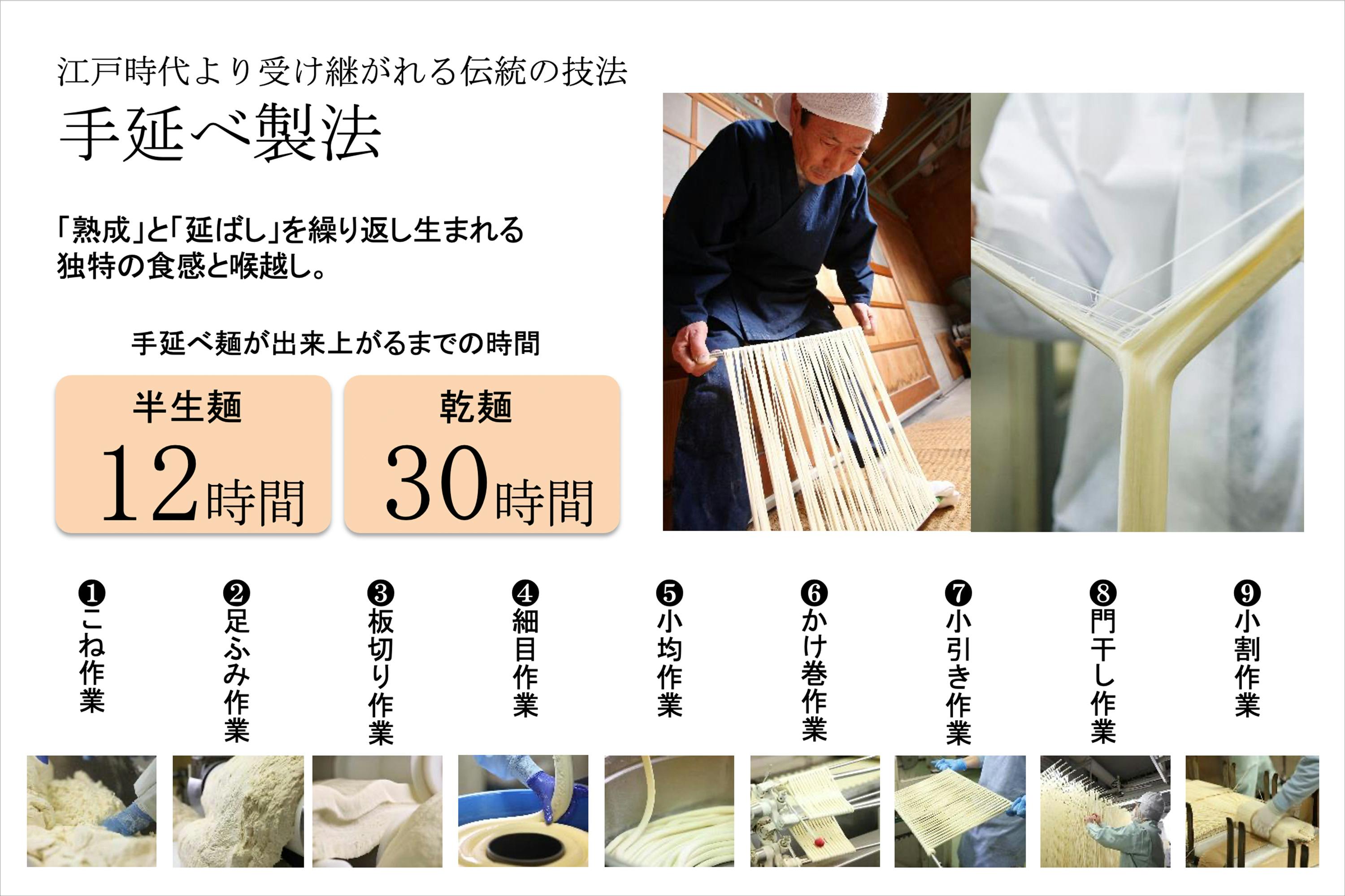 江戸時代より受け継がれる伝統製法である「手延べ製法」は、讃岐の「手打ち製法」とは違い刃物を使わず熟成と延ばしを繰り返しながら麺をひたすら延ばしていき、生地を仕込んでから麺に仕上げるまで、およそ30時間、休む間もない作業を繰り返します。