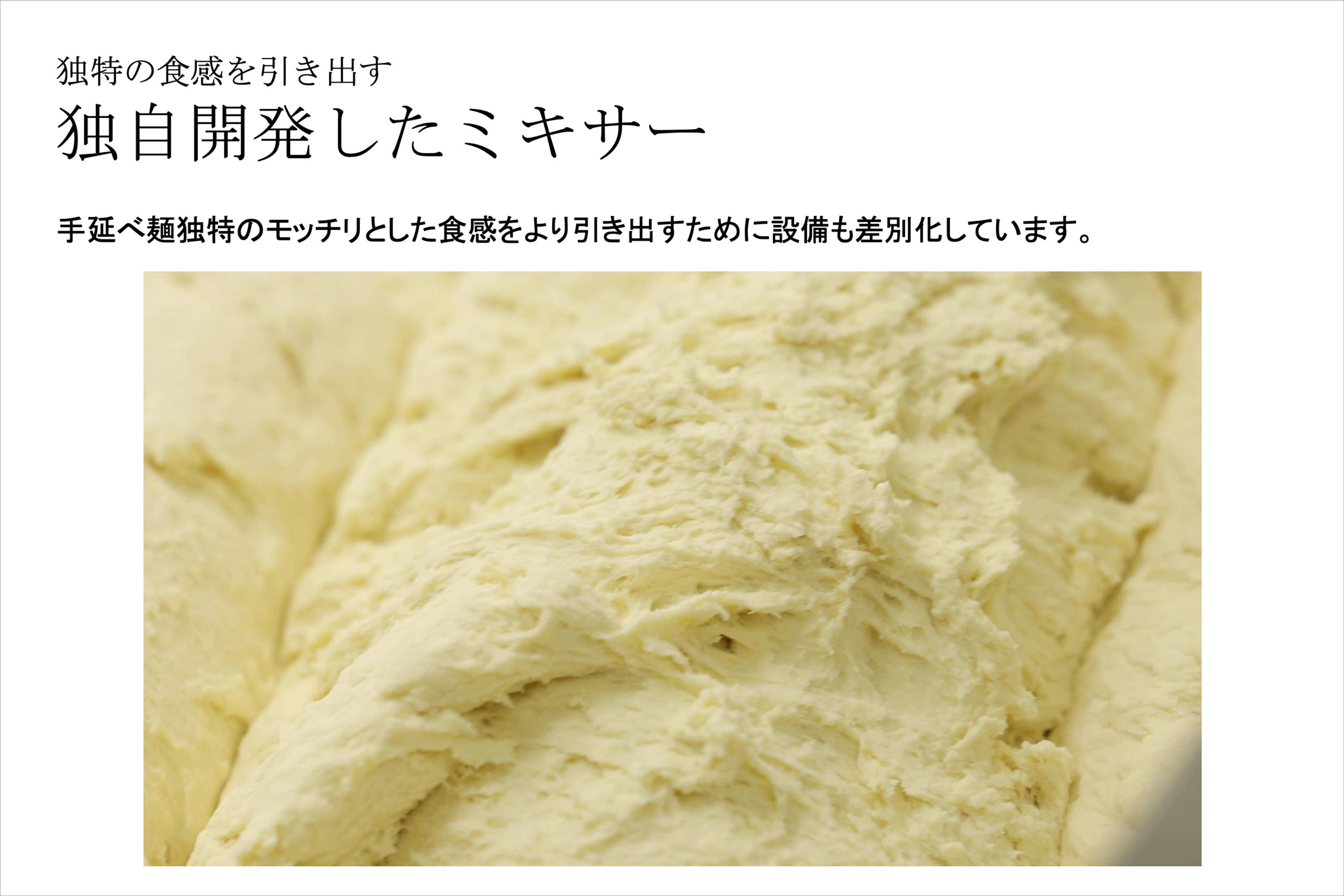 自社開発のミキサーをコネ作業に使うことにより、特に麺生地を折りたたみながら練り上げる工夫をしております。
