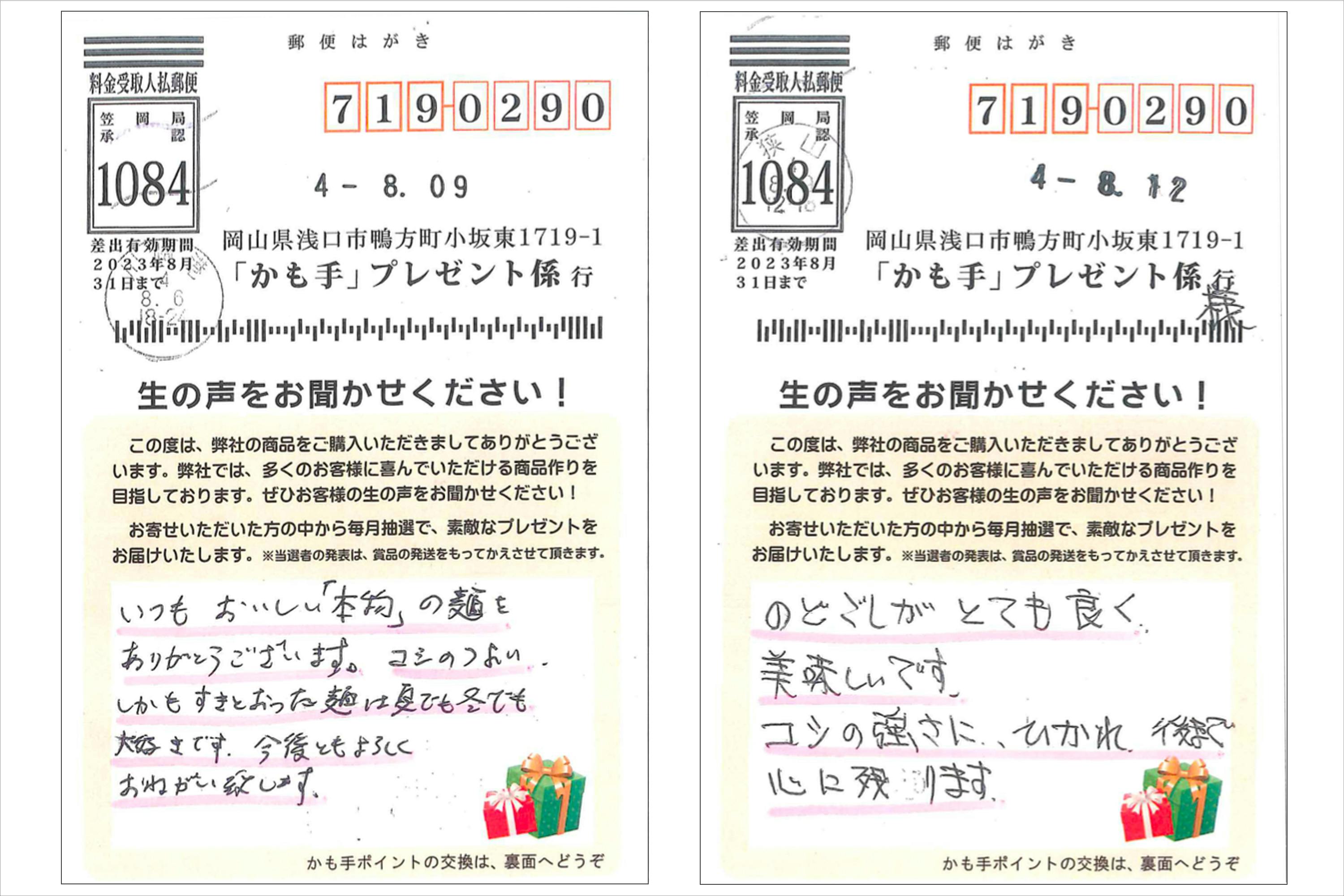 皆様に頂いたメッセージを胸に今後も手延べ製法のおいしいめんを製造し続けます。