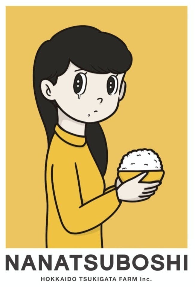第一回を記念し国内外でも活躍され注目を集めている現代アーティストのPOPでキュートなイラストレーションを完全オーダーによる、お米袋としては今まで類を見ないパッケージデザインとなっております。彼の代表的なモチーフである、一粒の涙を目に浮かべる瞬間を描いた一連の作品シリーズ 「 eye water 」がデザインされている北海道つきがたFARMのご飯を手にした女の子。