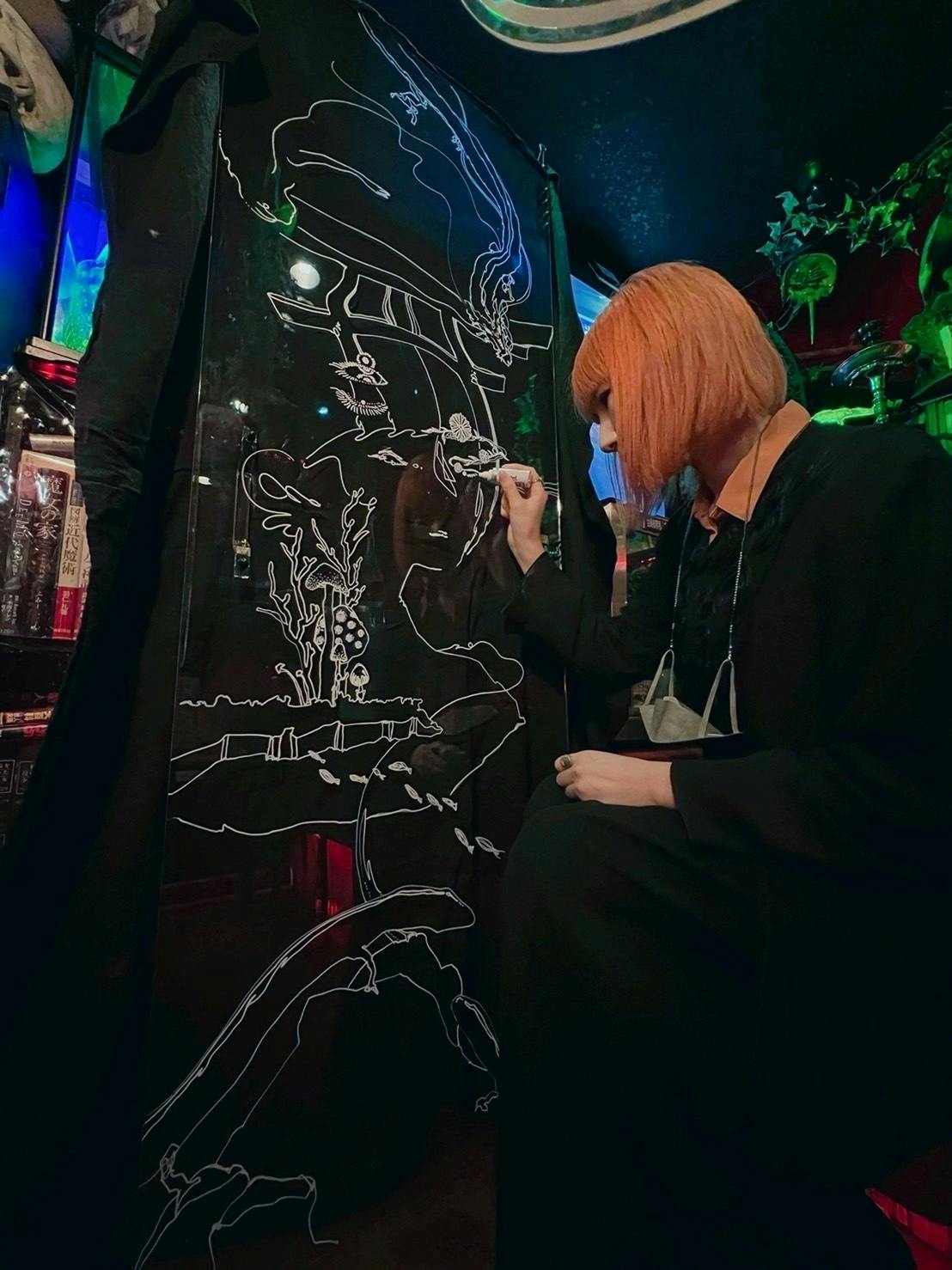匠工芸様に制作いただいたアクリルの扉には、岡山のイラストレーターshinPo mai氏の作品が描かれています。