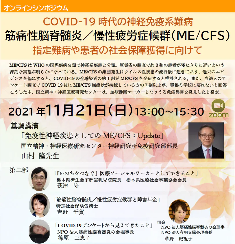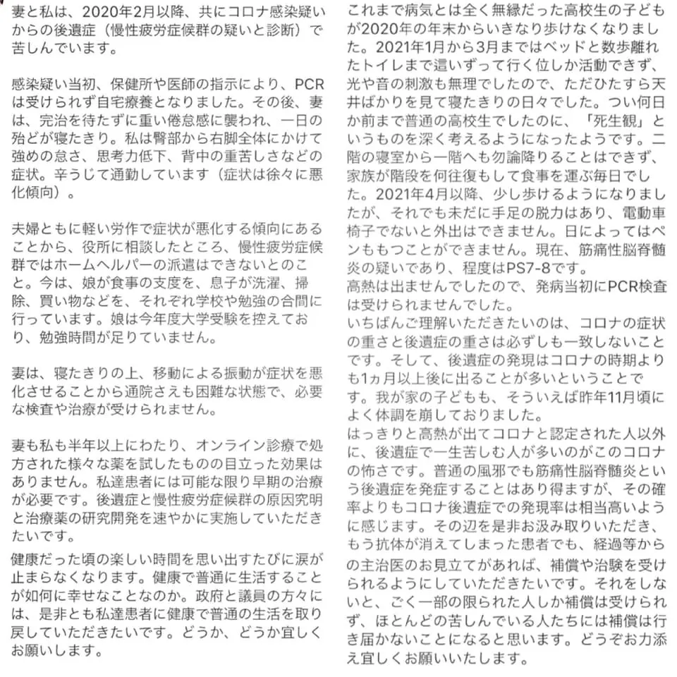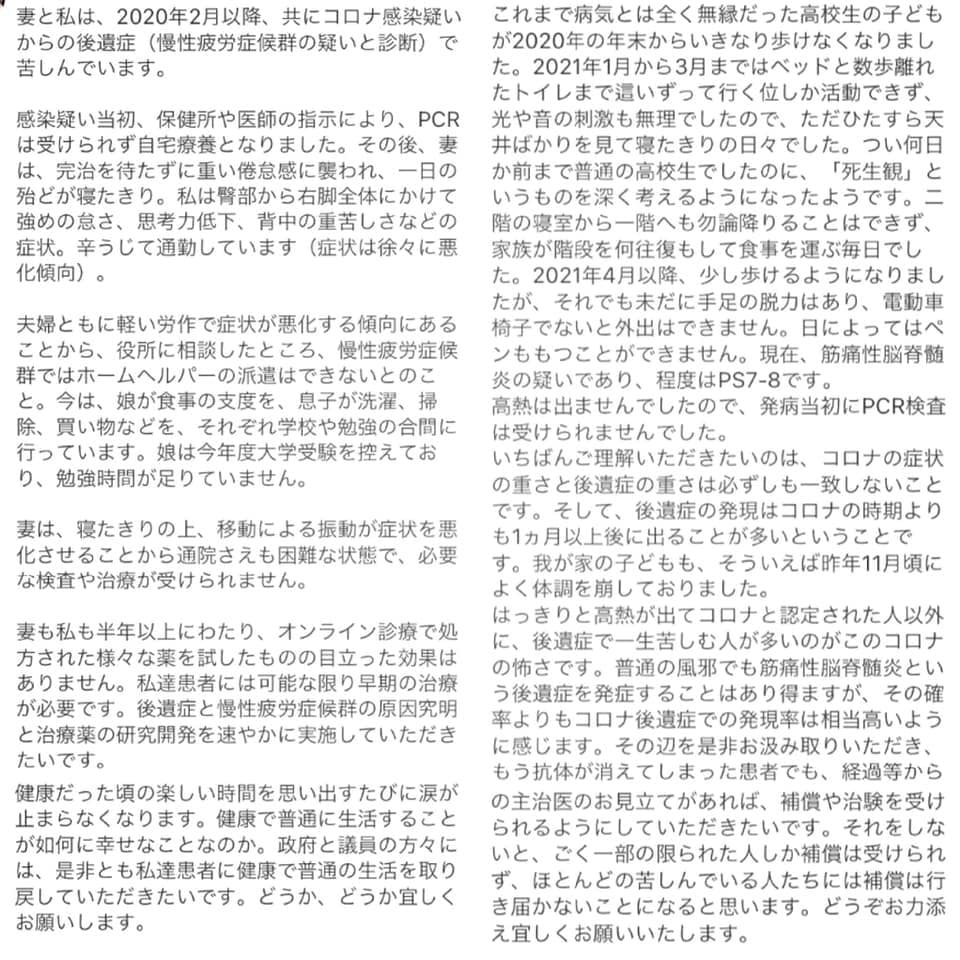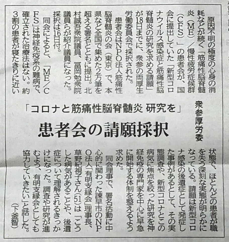 そういった中で、新型コロナウイルスの後遺症および後遺症から発症される方が増えてきている筋痛性脳脊髄炎・慢性疲労症候群の方の支援を感染前よりさせていただいており、昨年は研究を求める請願の署名活動を行い、衆参両院で可決されました。