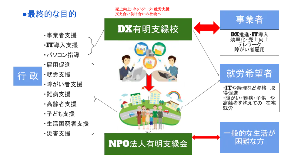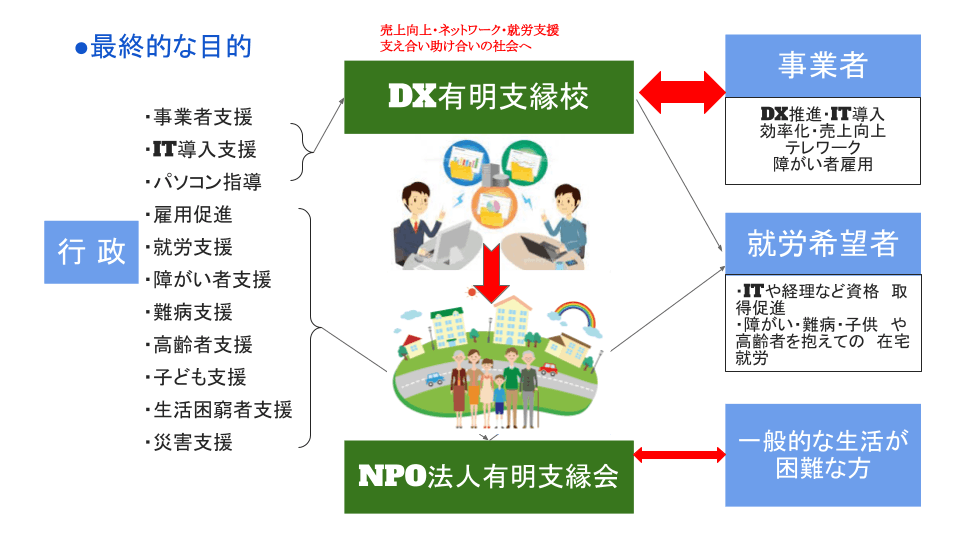 収益事業として「DX有明支縁校」を始めましたが、コロナ禍で売上が落ちてしまった事業者の方などの支援から、普通に生きられない方々の支援へ繋げるため、下記の様な流れで取り組めたらと思っております。