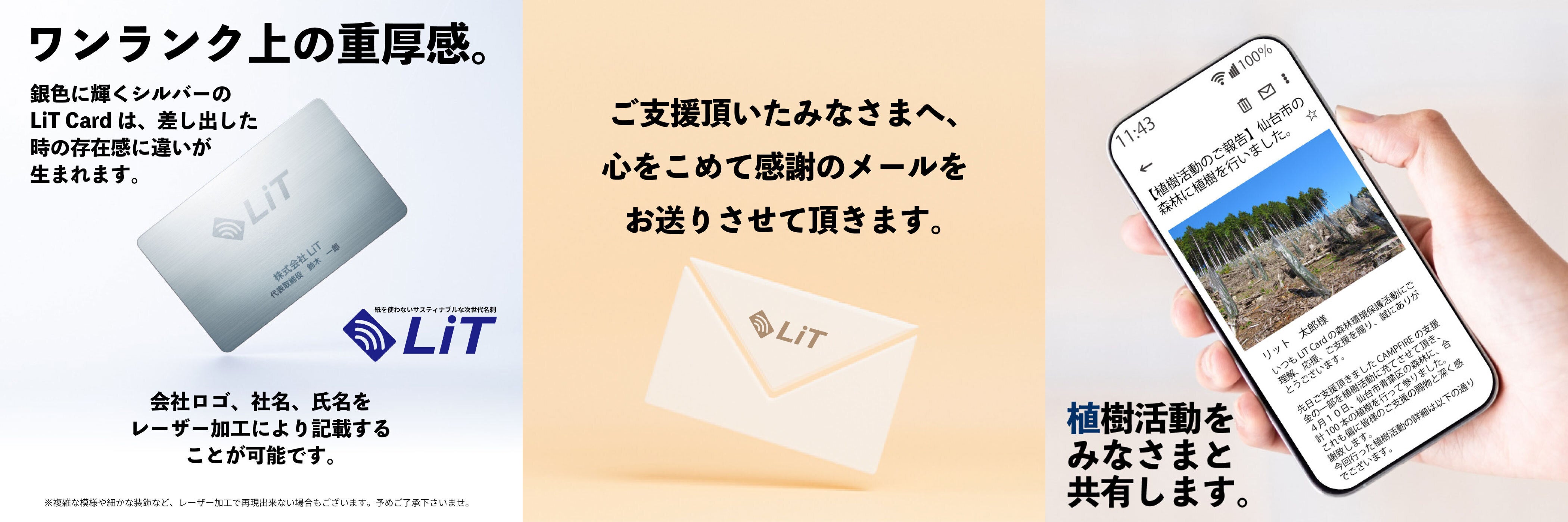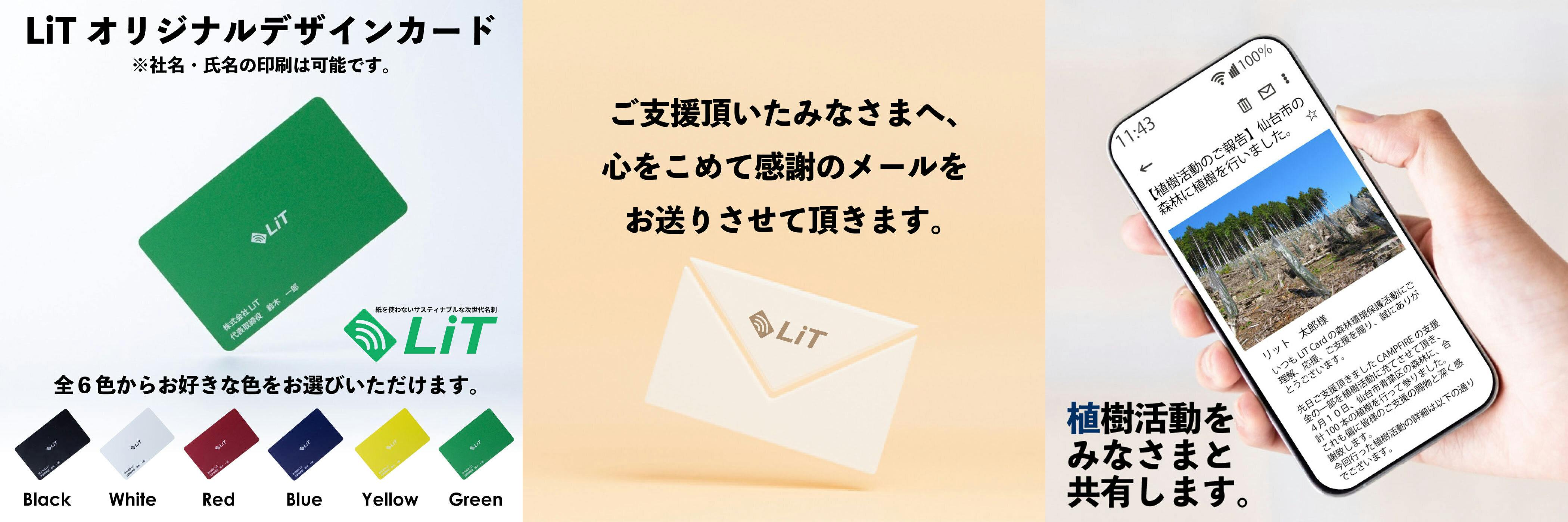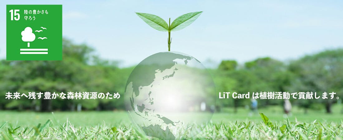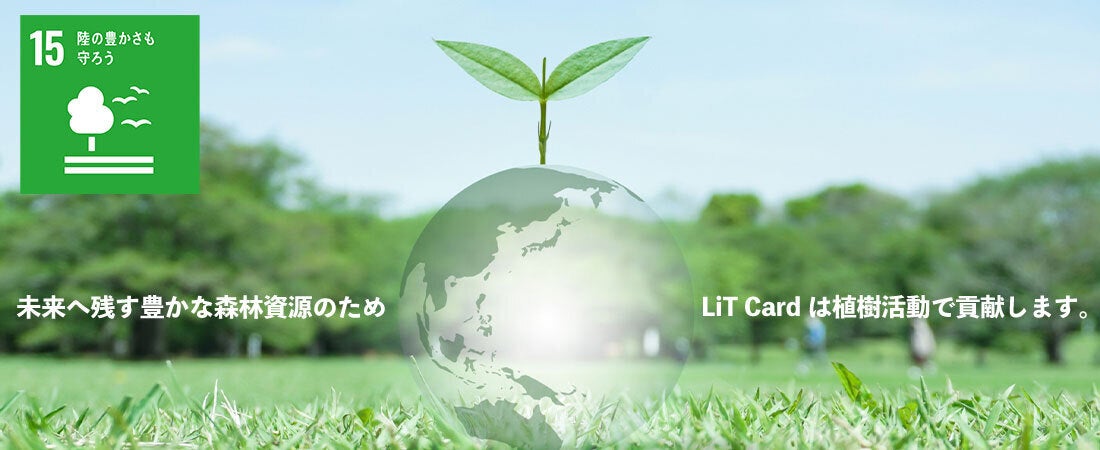 また、当プロジェクトは、ただLiT Cardを普及させるだけでの目的ではなく、皆様からご支援頂いた支援金の一部を、植樹活動にも充てさせて頂き、減っていく森林資源の保護に貢献して参ります。