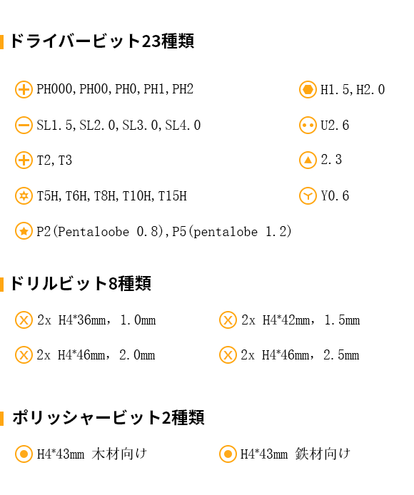 ・23つのビット、8つのドリル、2つのポリッシャー、合計33個のガジェットが付属しており、届いてからすぐに使用可能。